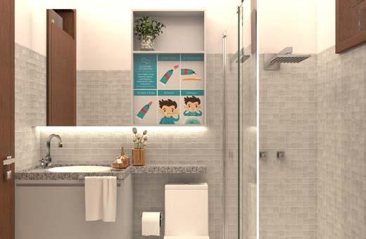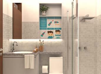 No banheiro das crianças (Figura 64), mantém-se o padrão de tons claros, mas com um revestimento mais lúdico na área do box, com uma textura que simula um granilite com cores mais vibrantes, o Granilite Glitter da Itagres.