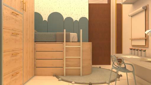 Devido a questão sensorial de Theo, citada pelos psicólogos, por meio de pulos, subidas e descidas e outros aspectos relacionados a propriocepção, como meio de auto regulação; a cama de Theo (Figura 44) foi pensada em um nível a 80cm do piso, para que ele possa subir para o ambiente de repouso, separando-o do espaço de brincar e de estudar na hora de dormir; além de fazer com que a cama seja um espaço de auto regulação após uma crise, o que é chamado por Mostafa de espaços de fuga (scape zone).
