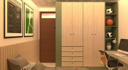 O quarto de Pietro (Figura 58 e 59) trabalha com cores no tom de verde, sendo pintura na cor Regata e Ar Refrescante da Suvinil, e os móveis em marcenaria amadeirada e verde, um combinado de Castanheira Natural e Sálvia da Arauco.