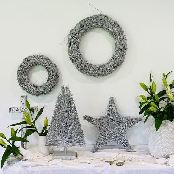 DW172 $27.27 Min 4 Marc Wreath - Blond Rattan FN007 $29.55 Min 3 Krissy Star Silver Large 94cm FN008 $13.64 Min 4 Krissy Star Silver med 51cm FN010 $13.64 Min 8 Krissy Wreath Silver Med 34d FN011 $18.18 Min 4 Krissy Wreath Silver Lg 49d FN013 $15.91 Min 4 Krissy Silver Cross 60x55 CX002 $9.09 Min 6 LED Garland Slv Beads 143cm CX003 $8.18 Min 6 LED Garland Slv Stars 143cm CX011 $9.09 Min 6 LED Garland Shells 110cm CX012 $9.09 Min 6 LED Garland Btle/Shell 110cm CX027 $9.09 Min 6 LED Garland w Mixed Shells CX028 $1.08 Min 6 LED Garland w White Pegs CX010 $8.18 Min 6 LED Garland Silver Reindeer FN009 $15.91 Min 4 Krissy Tree Silver Med 30 x 60 FN012 $31.82 Min 2 Krissy Tree Silver w stars 182h CB263 Min 3 $45.45 Krissy Tree w desc h78 wh.