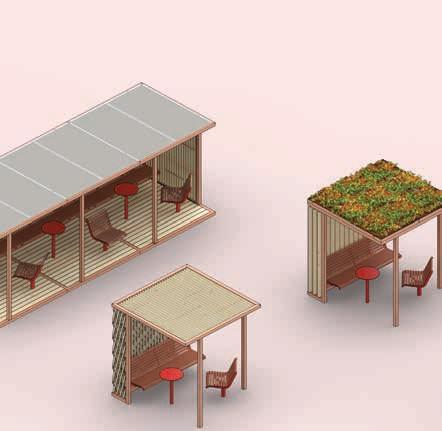 struttura in acciaio, tetto in tessuto rivestito in PVC, struttura in acciaio con doghe in legno, che funge da area relax