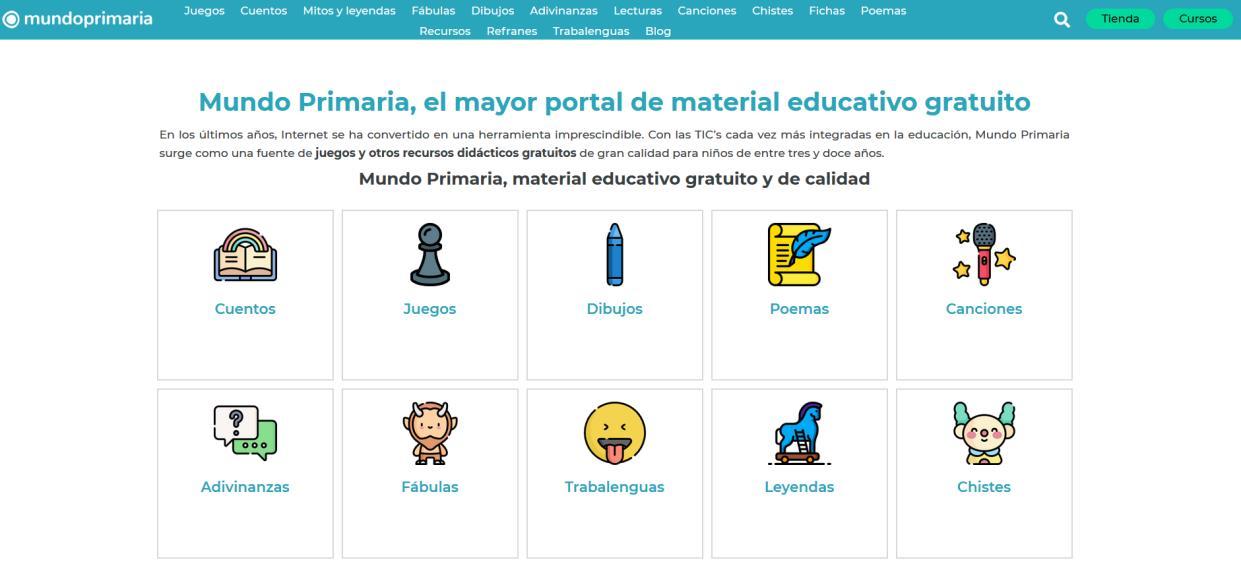 Mundo Primaria es un lugar de aprendizaje entretenimiento. Como está dirigido principalmente a niños y niñas entre 3 y años, los contenidos relacionados con las asignaturas del colegio aparecen organizados por cursos, áreas temáticas y edades. https://www.mundoprimaria.com/#:~:text=Mundo%20Primaria %20es%20un%20lugar,cursos%2C%20%C3%A1reas%20tem% C3%A1ticas%20y%20edades.