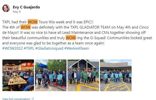 Ryan Lopez, who is a member of the Culture Committee and CM in TXFW said, “it’s important to remember that we are always in a state of improvement. Always ask yourself ‘what can I improve today? As far as our residents, it’s not just about the rules but the message and culture behind it. A place that adds value and pride of homeownership. It’s important to set the example starting with the office staff, maintenance and beyond. When we as a team do better, they want to also.”