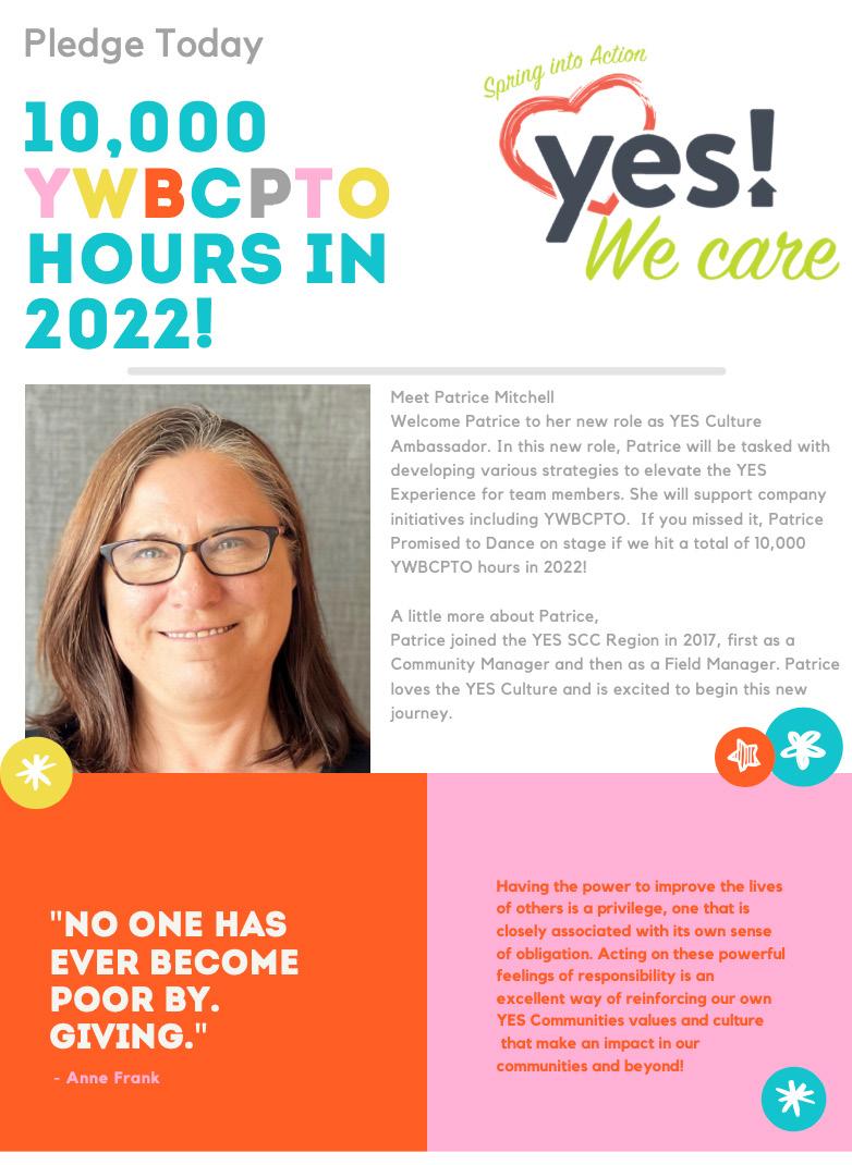 We have dedicated hundreds of thousands of dollars and thousands of hours as a company to give back. With our YES We Care program, we continue to assist our team members, residents, communities and the broader community. This year YES is striving to attain as close to 10,000 YES We Care PTO donated hours of volunteering. So what does this mean? We need you to help us get there because we want to live our mission: Helping People Live Rich, Meaningful Lives One Person, One Family, One Home, and One Community at a Time.