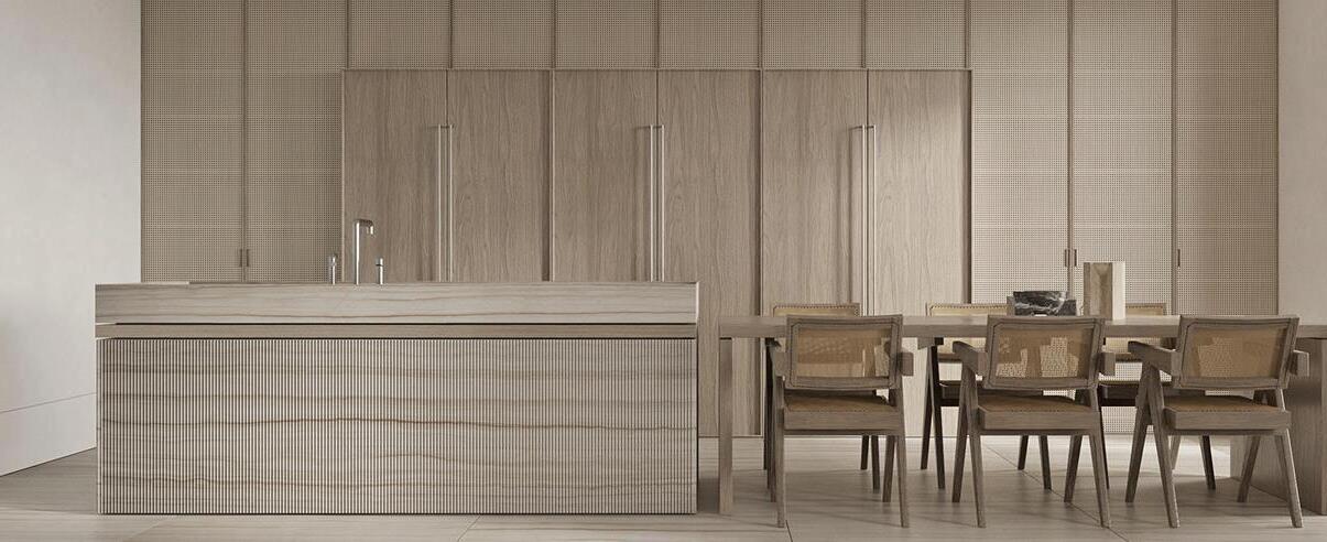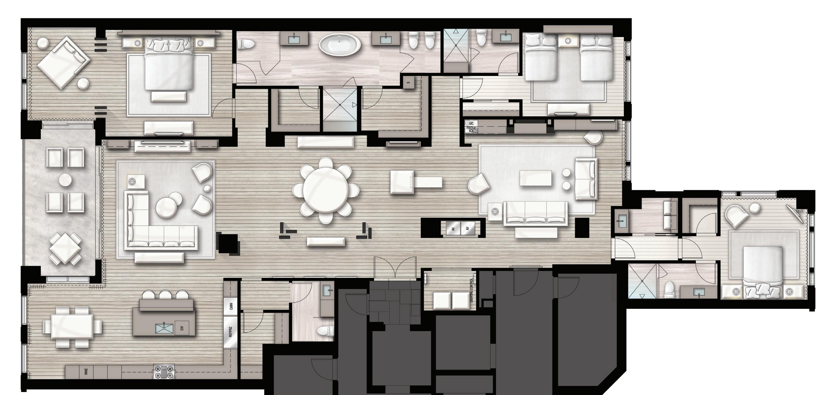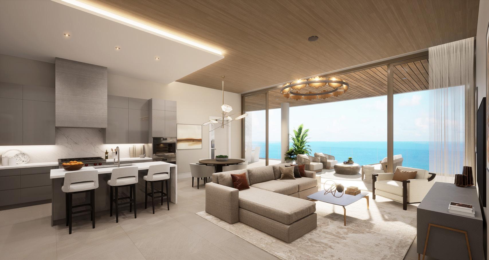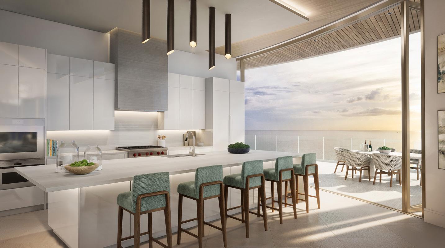 Filled with light and space, the Residences are distinctive modern homes with between 10-foot and 12-foot ceilings and floor-to-ceiling windows framing unobstructed water views. Each residence has its own private elevator vestibule, covered parking, and private storage area. Kitchens are enhanced by stone counters, European-style cabinetry, Franke sinks, Dornbracht faucets and professional-grade appliances by Sub-Zero, Wolf, and Cove, for flawless entertaining and everyday meals. Bathrooms are equally impressive with spacious closets, marble appointments, sculptural free-standing master tubs, and large showers with Dornbracht fixtures.