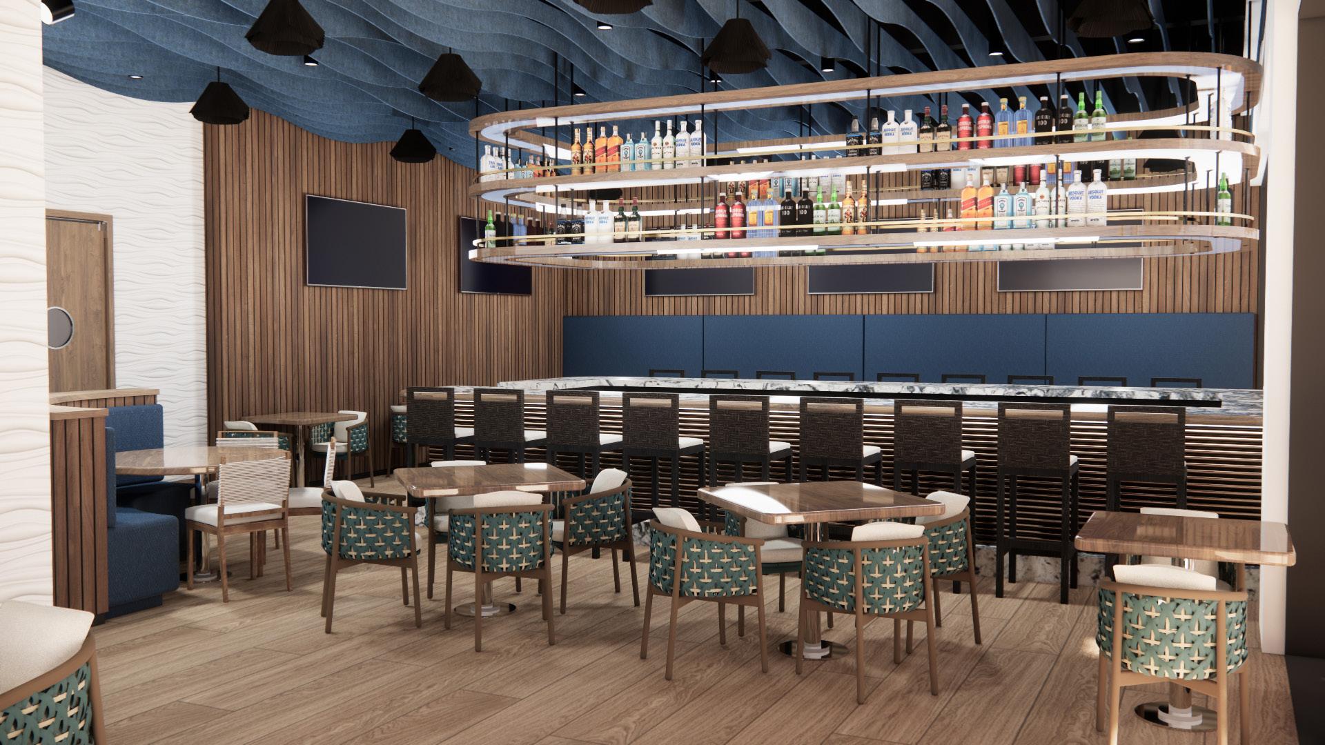 A hotel commissioned Marc-Michaels Interior Design to redesign their restaurant originally designed by the firm several years ago. To fulfill their missing niche of a seafood inspired restaurant, the firm was in charge of revamping the old space into a cutting edge seafood/ sushi restaurant. The clean modern designs included mixed metallic elements and glass with oceanic inspired features. A large custom glass bubble chandelier along with a flowing wave-patterned glass light fixture delivered the feeling of a true under-the-sea dining experience.