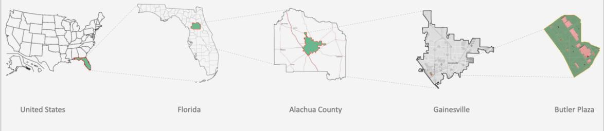 Butler Plaza is a 50-acre site located in Gainesville's main shopping and dining district. The site is heavily underdeveloped and most of the space is dedicated to parking