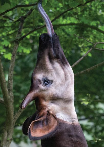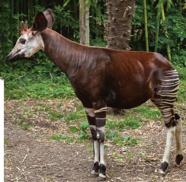THE OKAPI LOOKS LIKE A MIX BETWEEN A ZEBRA AND A GIRAFFE.