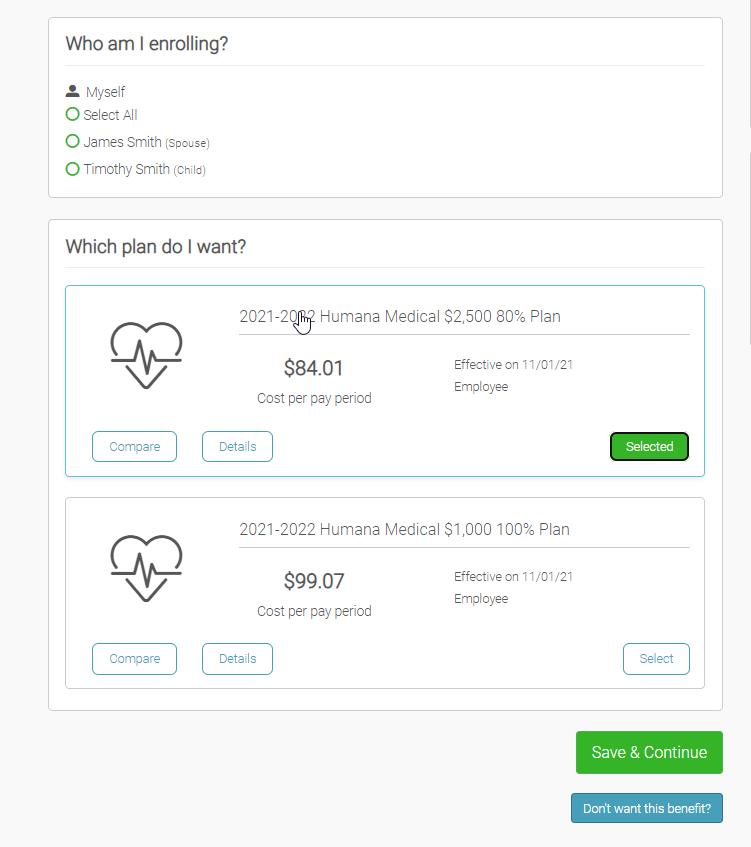 Below your dependents you can view your available plans and the cost per pay To elect a benefit, click Select Plan underneath the plan cost