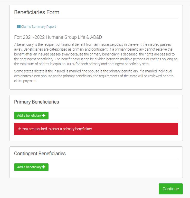 If you have elected benefits that require a beneficiary designation or completion of an Evidence of Insurability form, you will be prompted to add in those details