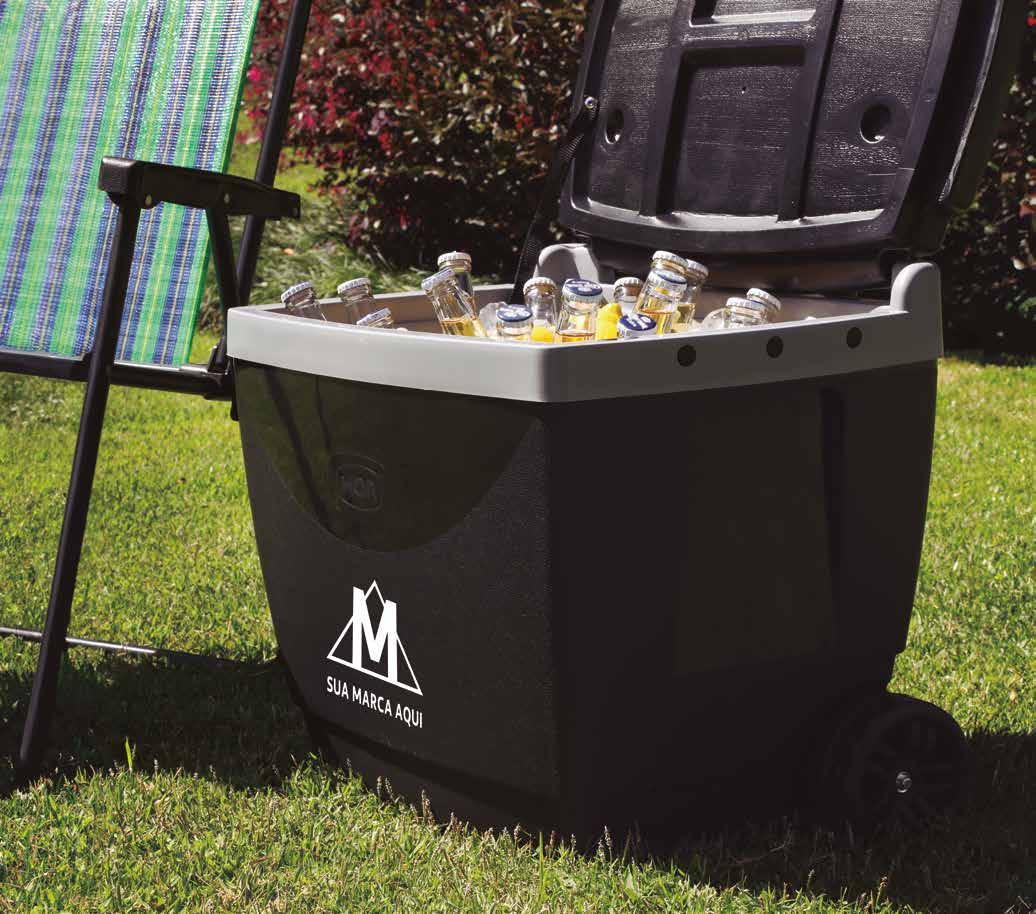 Aplicação do logotipo na frente da caixa Isolamento térmico em isopor | Material 100% virgem Ótimo custo-benefício | Boa conservação térmica Prática e fácil de usar | Tampa com porta-objetos Alça confortável | Fácil de limpar Tampa com trava de segurança na alça