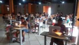 As 30 máquinas de costura estão dispostas em 04 filas compondo o espaço com suas respectivas cadeiras, já identificadas para cada integrante do grupo, tendo cada máquina sua entrada deeletricidade.
