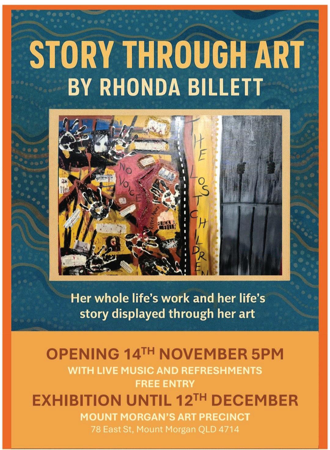 NOV 14: Story through Art Exhibition OpeningRhonda Billet. Live music and refreshments. Free Entry. Exhibition runs until 12 December. Mount Morgan’s Arts Precinct, 79 East Street.