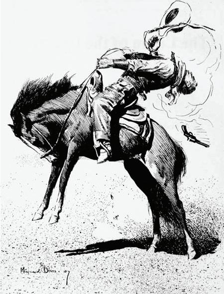 This fantastic illustration of a buckjumper comes from the book Loom of the desert by Idah Meacham Strobridge (1907) on Project Gutenberg, which is copyright-free and in the public domain.