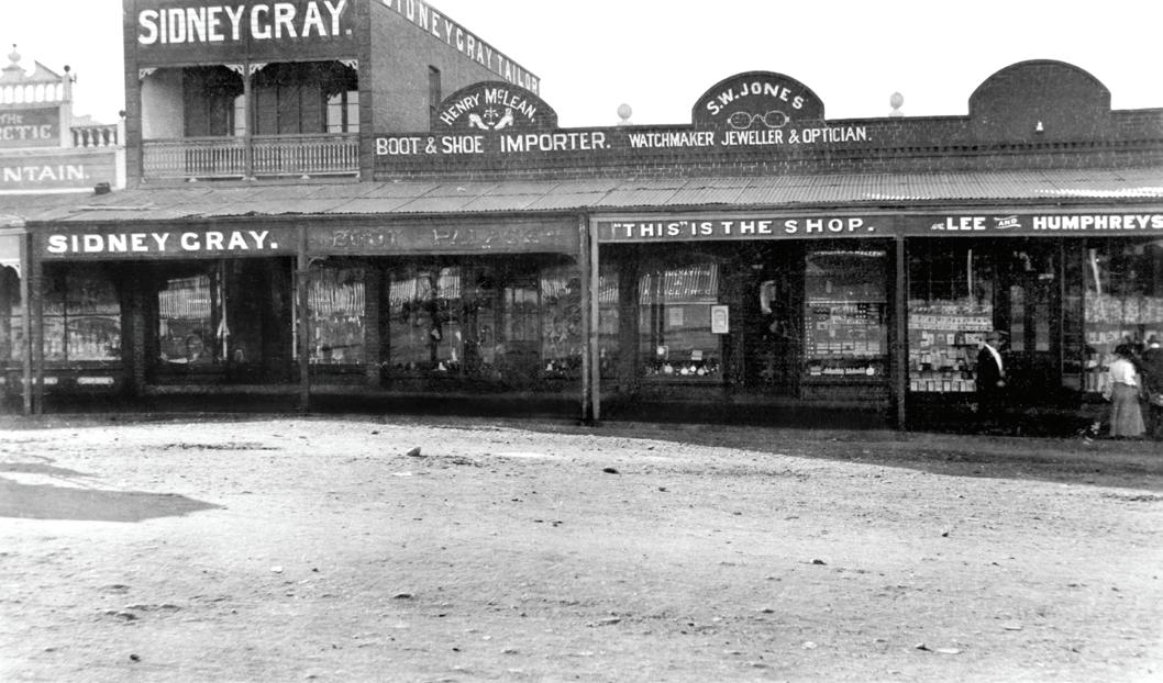 Above: 1913 / A closer view of shopfronts near the corner of Morgan Street and Morgan Lane / (l-r): A glimpse of Mrs J. Winter’s Arctic Fountain refreshment rooms; Sidney Gray, tailor (Mount Morgan Outdoors occupies this building today; previously, the Ramm family for over fifty years); Henry McLean, boot and shoe importer (a pair of white canvas button boots appear on the signage); S. W. Jones, watchmaker, jeweller and optician (the signage includes an image of a pair of ‘granny glasses’); Messrs. Lee and Humphreys, printers (Mount Morgan Hot Bread Shop currently trades from this building) / State Library of Queensland.