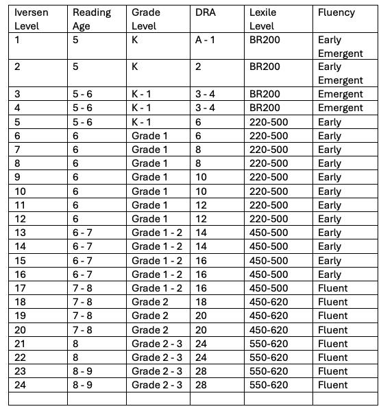 This chart illustrates how Iversen Publishing levels approximatley correlate to other commonly used reading levelling systems.