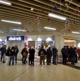 Atthefrontofthequeuetoget intothestoreat9amlastWednesday werepartnersLeighMorganandAbi Cankwhotravelledintotownfrom CrossHousesat5.30amand were first throughthe Darwin Centre’s doorsat8am.