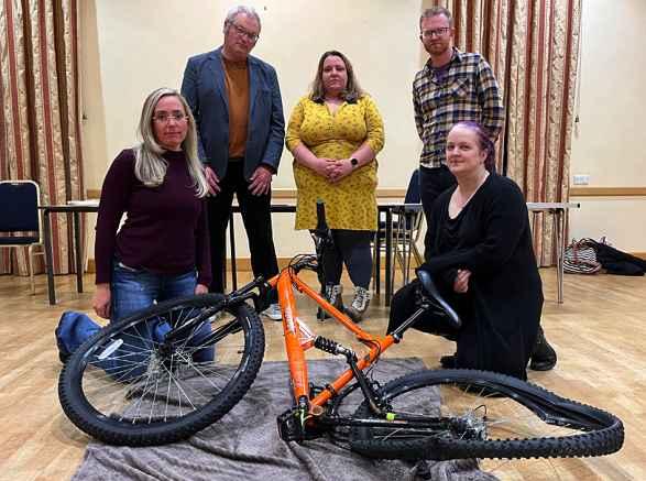 AngelaWarren (front right) and campaignerswith themangled wreckofherson’s bikeafterhewas hitbyacar