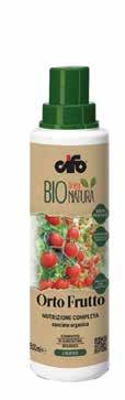 • La linea BioNatura Cifo comprende otto referenze, in formulati sia liquidi che granulari. Sono disponibili in entrambe le versioni, i concimi organici BioNatura Agrumi e BioNatura Orto Frutto. Tra i formulati liquidi troviamo poi BioNatura Bio Oro, un biostimolante, e BioNatura Universale, mentre completano la gamma dei granulari BioNatura Biotron S, energizzante radicale, ammendante e BioNatura Top N, bio-attivatore, concime universale.