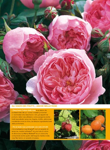 GLI ODORI DEI FRUTTI... ANCHE NELLE ROSE • Descrivere l’odore delle rose è un lavoro da professionisti. Un po’ come i maestri profumieri o i sommelier che descrivono i vini, gli esperti nel profumo delle rose utilizzano come paragone anche frutti (soprattutto lampone, fragola, mirtillo, albicocca) e sostanze come la mirra, da sempre ingrediente base della profumeria. • Tra le tante rose profumate con note di frutti c’è la bellissima rosa Alnwick®, con un accento di lampone, mentre la Evelyn® ha una nota di odore di albicocca. La Henry Matisse® ha un odore che comprende anche quello dell’anguria mentre molte rose Tea hanno un accento di pesca.