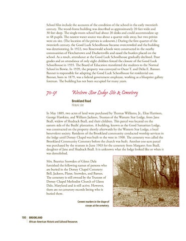 In May 1889, two acres of land were purchased by Thomas Williams, Jr., Elias Harrison, George Hawkins, and William Jackson, Trustees of the Western Star Lodge, from Jane Beall, widow of Shadrack Beall, and their children. This parcel was located on the eastern side of the Bealls’ plantation. A building, known as the Good Samaritan Lodge, was constructed on the property shortly afterwards by the Western Star Lodge, a local benevolent society. Residents of the Brookland community conducted worship services in the lodge until Dorsey Chapel was built to the west in 1900. The cemetery was called the Brookland Community Cemetery before the church was built. Another one-acre parcel was purchased by the trustees in June 1903 for the cemetery from Margaret Ann Beall, daughter of Jane and Shadrack Beall. It is unknown what the lodge looked like or when it was demolished. Mrs. Beatrice Snowden of Glenn Dale furnished the following names of persons who are buried in the Dorsey Chapel Cemetery: Bell, Jackson, Plater, Snowden, and Barnes. The cemetery is still owned by the Trustees of Dorsey Chapel Methodist Church of Glenn Dale, Maryland and is still active. However, there are no cemetery records listing who is buried there. Cement markers in the shape of crosses at the cemetery.