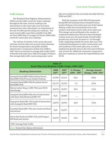 Traffic Volumes The Maryland State Highway Administration (SHA) records traffic counts for major roadways throughout the state. Several roadways and intersections in the sector plan area have been measured over time, allowing for an examination of the rate of traffic growth along area roadways. The most recent traffic count data available from SHA are from 2008. Map 23 on page 142 shows 2008 traffic counts for sector plan area roadways. The volume of vehicles in the sector plan area each day must be taken into account when planning for future transportation and public facilities infrastructure. Comparison of data from 2000 to 2007 shows an increase in average daily traffic (ADT) within the sector plan area. Table 29 on page 143 shows that average daily traffic counts along major sector