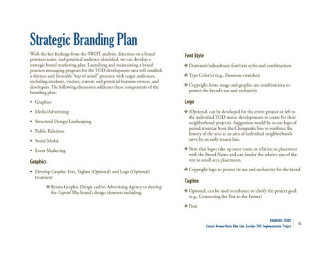 Strategic Branding Plan With the key findings from the SWOT analysis, direction on a brand position/name, and potential audience identified, we can develop a strategic brand marketing plan. Launching and maintaining a brand position messaging program for the TOD development area will establish a distinct and favorable “top of mind” presence with target audiences, including residents, visitors, current and potential business owners, and developers. The following discussion addresses these components of the branding plan: