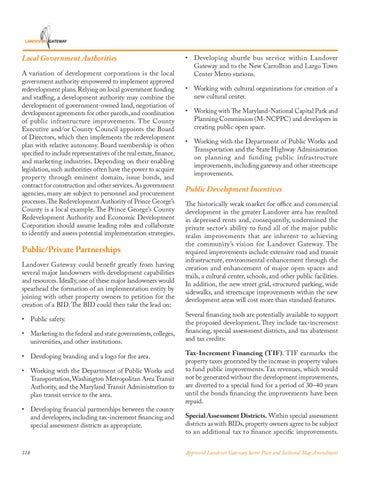 Public/Private Partnerships Landover Gateway could benefit greatly from having several major landowners with development capabilities and resources. Ideally, one of these major landowners would spearhead the formation of an implementation entity by joining with other property owners to petition for the creation of a BID. The BID could then take the lead on: • Public safety. • Marketing to the federal and state governments, colleges, universities, and other institutions. • Developing branding and a logo for the area. • Working with the Department of Public Works and Transportation, Washington Metropolitan Area Transit Authority, and the Maryland Transit Administration to plan transit service to the area. • Developing financial partnerships between the county and developers, including tax-increment financing and special assessment districts as appropriate.