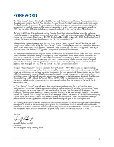 Foreword The Prince George’s County Planning Board of The Maryland-National Capital Park and Planning Commission is pleased to make available the 2010 New Carrollton Approved Transit District Development Plan and Transit District Overlay Zoning Map Amendment. The approved transit district development plan contains recommendations for future transit-oriented development. The approved transit district overlay zoning map amendment expands the 1989 New Carrollton TDOZ to include properties north and south of the New Carrollton Metro Station. On June 16, 2009, the District Council and the Planning Board held a joint public hearing on the preliminary transit district development plan and proposed transit district overlay zoning map amendment. The Planning Board adopted the plan with modifications per PGCPB Resolution No. 09-120 in September 2009. The District Council approved the plan with additional modifications per CR-33-2010 in May 2010. Policy guidance for this plan came from the 2002 Prince George’s County Approved General Plan; land use and transportation studies conducted by the Prince George’s County Planning Department; and county functional area master plans, including the 2005 Approved Countywide Green Infrastructure Plan, the 2008 Approved Public Safety Facilities Master Plan, and the 2009 Approved Countywide Master Plan of Transportation. The overall development concept proposed by this plan builds on the recommendations of the 2004 New Carrollton Transit-Oriented Development Strategy Planning Study. Input on proposed public infrastructure investments was provided by an Urban Land Institute Technical Assistance Panel convened in July 2007. Community planning workshops were held in December 2007 and April 2008. Those workshops and an extensive outreach program provided the community with the opportunity to express its concerns on planning issues. As a result, this is an approved plan developed for—and with the help of—the New Carrollton community. This plan reflects the county’s vision to transform the New Carrollton Metro Station area into a premiere highintensity urban center and regional destination anchored by a transformed Metro station and featuring a walkable mixed-use environment and a diverse residential community. The plan recommends changes in land use and future public infrastructure investments. The plan also specifies steps for phased development at the Metro station, a preliminary public facilities implementation strategy, and commercial revitalization along Annapolis Road between Veterans Parkway (MD 410) and the Capital Beltway (I-95/I-495). The transit district overlay zoning map amendment includes zoning changes to support implementation of the land use concepts in the transit district development plan. As Prince George’s County’s only full-service intermodal transportation center, the New Carrollton Metro Station presents an untapped opportunity to create a livable, pedestrian-friendly, and vibrant community. During the planning process, we asked area residents to envision how the New Carrollton area will develop into that community, and to propose the changes necessary to make that happen. We are continuing this effort countywide through the Envision Prince George’s initiative that has engaged a broad cross section of stakeholders in developing a shared vision for the county’s future direction and growth. We invite you to visit the Envision Prince George’s website at www.mncppc.org/Envision to learn more about how to participate in this exciting initiative. The Planning Board appreciates the contributions of the community and stakeholders throughout the development of the plan. As a result of the community’s participation and commitment, this plan provides the foundation for the creation of a vibrant, mixed-use, transit-oriented metropolitan center around the New Carrollton Metro Station that will benefit New Carrollton and Prince George’s County citizens and residents for years to come. Sincerely,