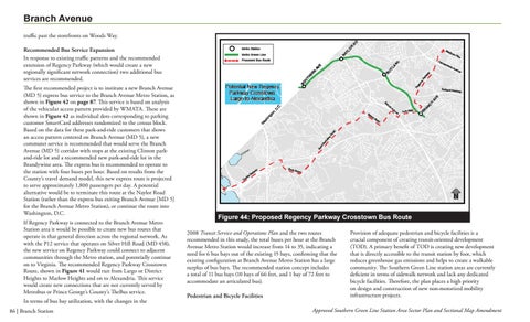 Figure 44: Proposed Regency Parkway Crosstown Bus Route 2008 Transit Service and Operations Plan and the two routes recommended in this study, the total buses per hour at the Branch Avenue Metro Station would increase from 14 to 35, indicating a need for 6 bus bays out of the existing 15 bays, confirming that the existing configuration at Branch Avenue Metro Station has a large surplus of bus bays. The recommended station concept includes a total of 11 bus bays (10 bays of 66 feet, and 1 bay of 72 feet to accommodate an articulated bus).