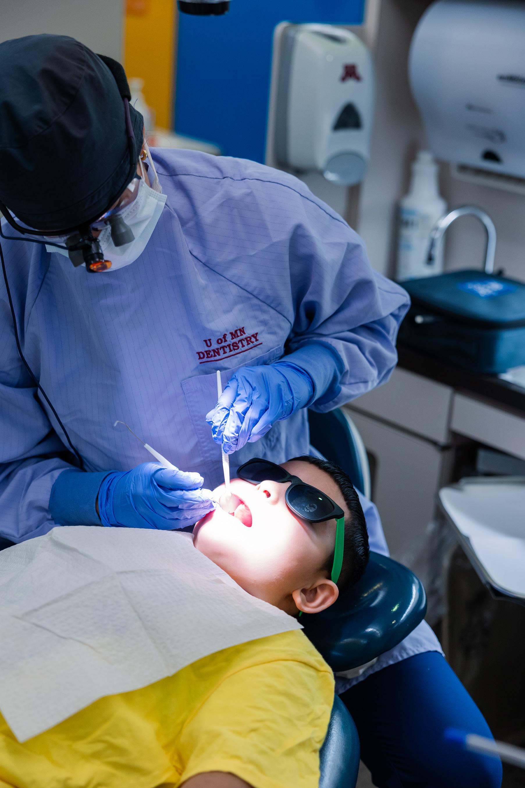 This program provides free exams, fillings, extractions, root canals, partial dentures, children’s dentistry, hygiene, and oral health education in a large temporary clinic set up in a city in Minnesota.