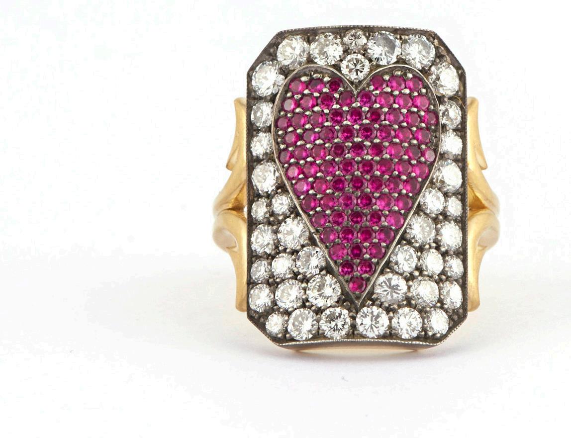 Heart Ten Table 18K Yellow Gold & Sterling Silver with Old European Cut Diamonds 1.95 Carats & Rubies 1.51 Carats Ring $16,000