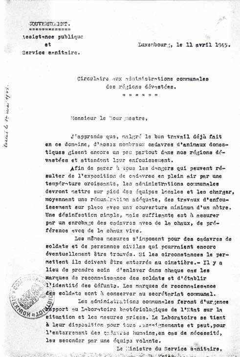 Ein Schreiben der Assistance publique et service sanitaire forderte die Luxemburger Gemeinden am 11. April 1945 auf, eine genaue Aufstellung der noch unbeerdigten Soldaten sowie der toten Tiere zu machen. Diese sollten dann umgehend begraben werden, um einer Seuche vorzubeugen. Am 2. August wurde dann eine Anweisung des Obersten Hauptquartiers der Alliierten der luxemburgischen Regierung an die Gemeinden weitergeleitet: Ein Gre-