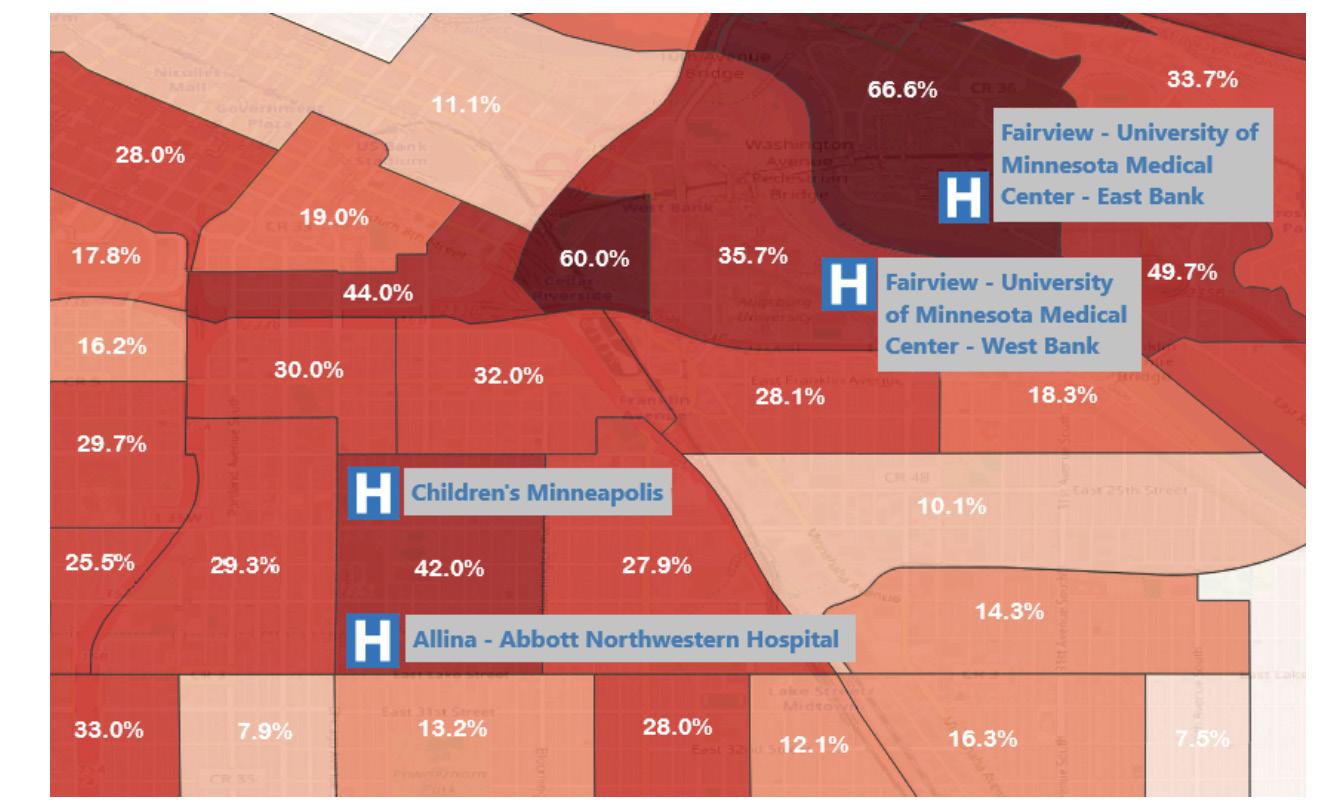 In Minneapolis not far from Abbott Northwestern, Children’s Hospital Minneapolis, and University of Minnesota Medical Center (UMMC), census tracts can be found where more than 4 in 10 people live in poverty.