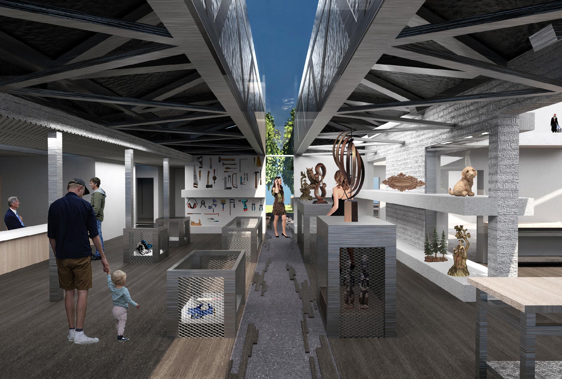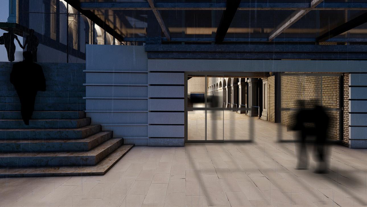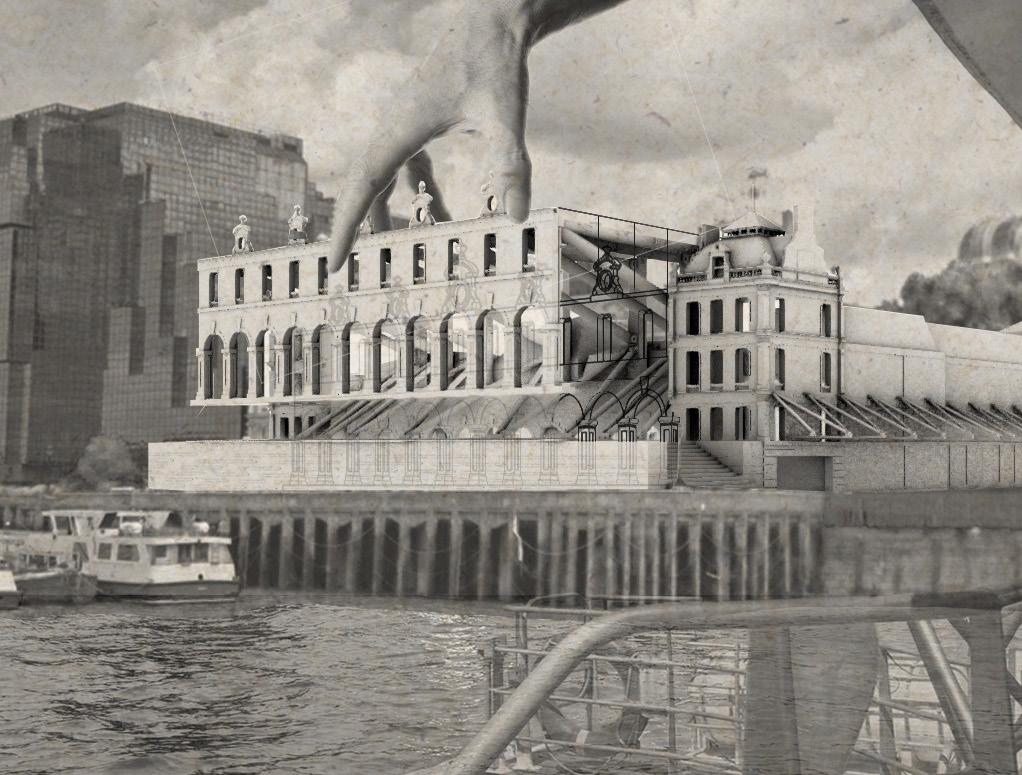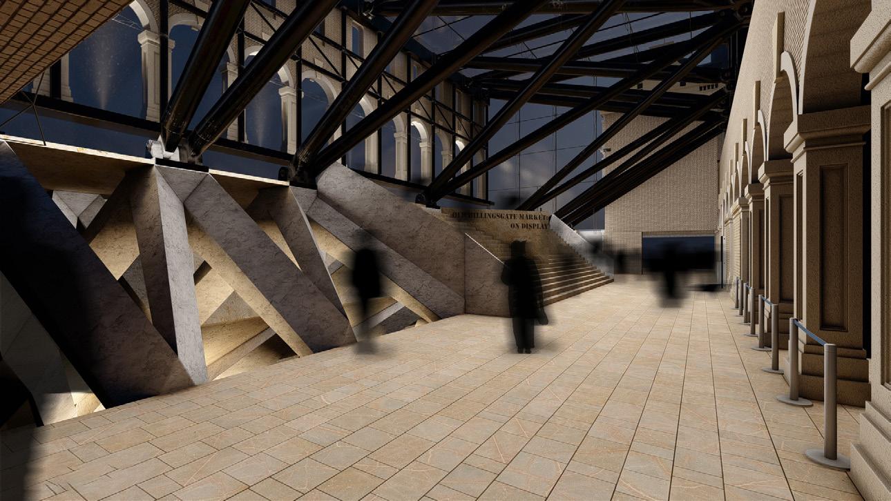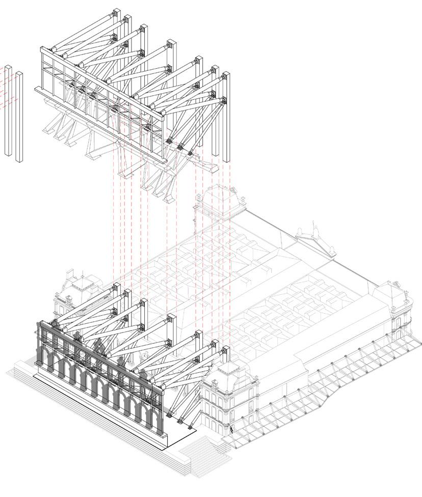 The design proposes a structure that originates in the basement and grows from the vaulted spaces while carrying a heavy language. As the structure rises, it transforms into a lighter form and creates a large cantilever to float the facade, preserving the openness and public space of the pier. The structure is designed to allow visitors to appreciate the Victorian style facade as a work of art and understand its framework and history.