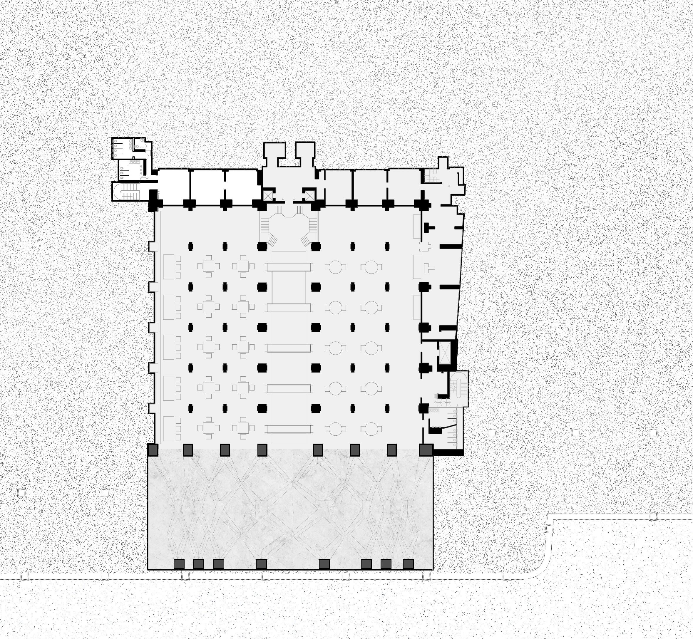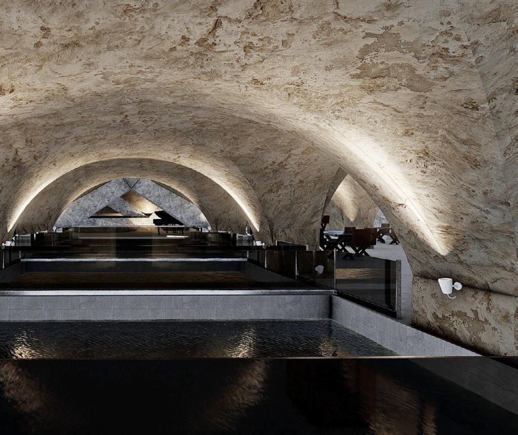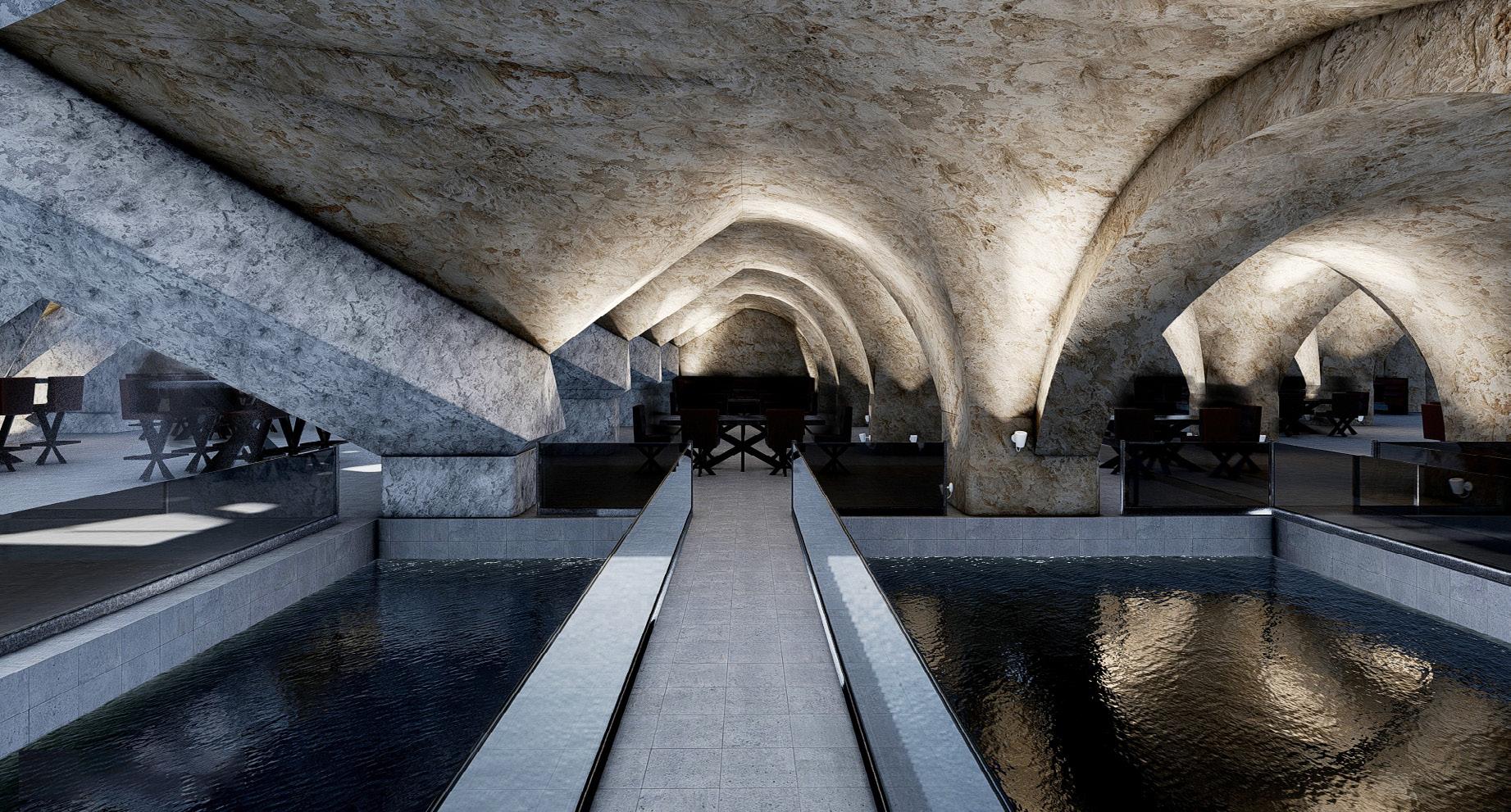 The basement has been imagined as a restaurant/bar that embodies the aesthetic of the vaulted spaces, and an elevated platform serves as a bar and seating area. The project also aims to capture a piece of the plaza and protect it from potential sea level rise.