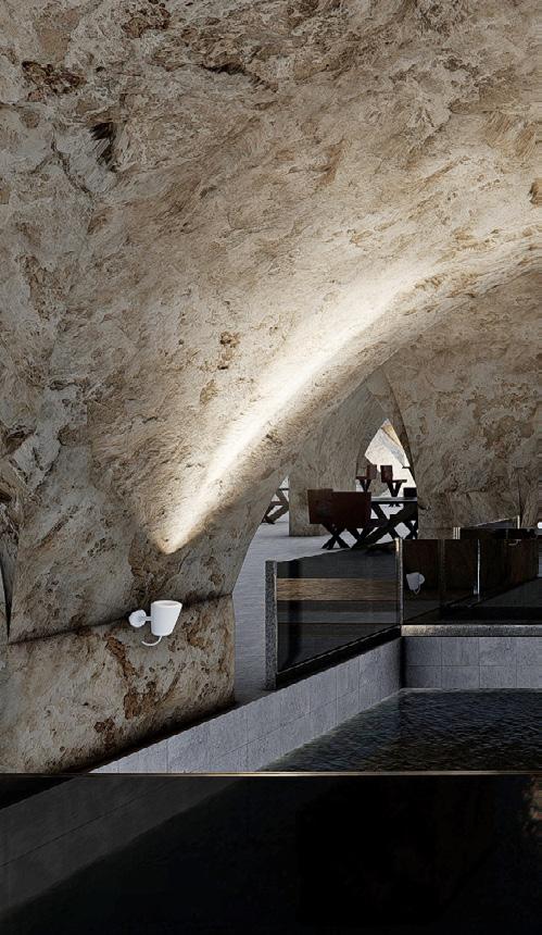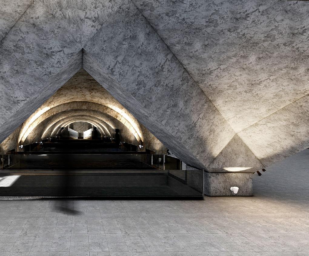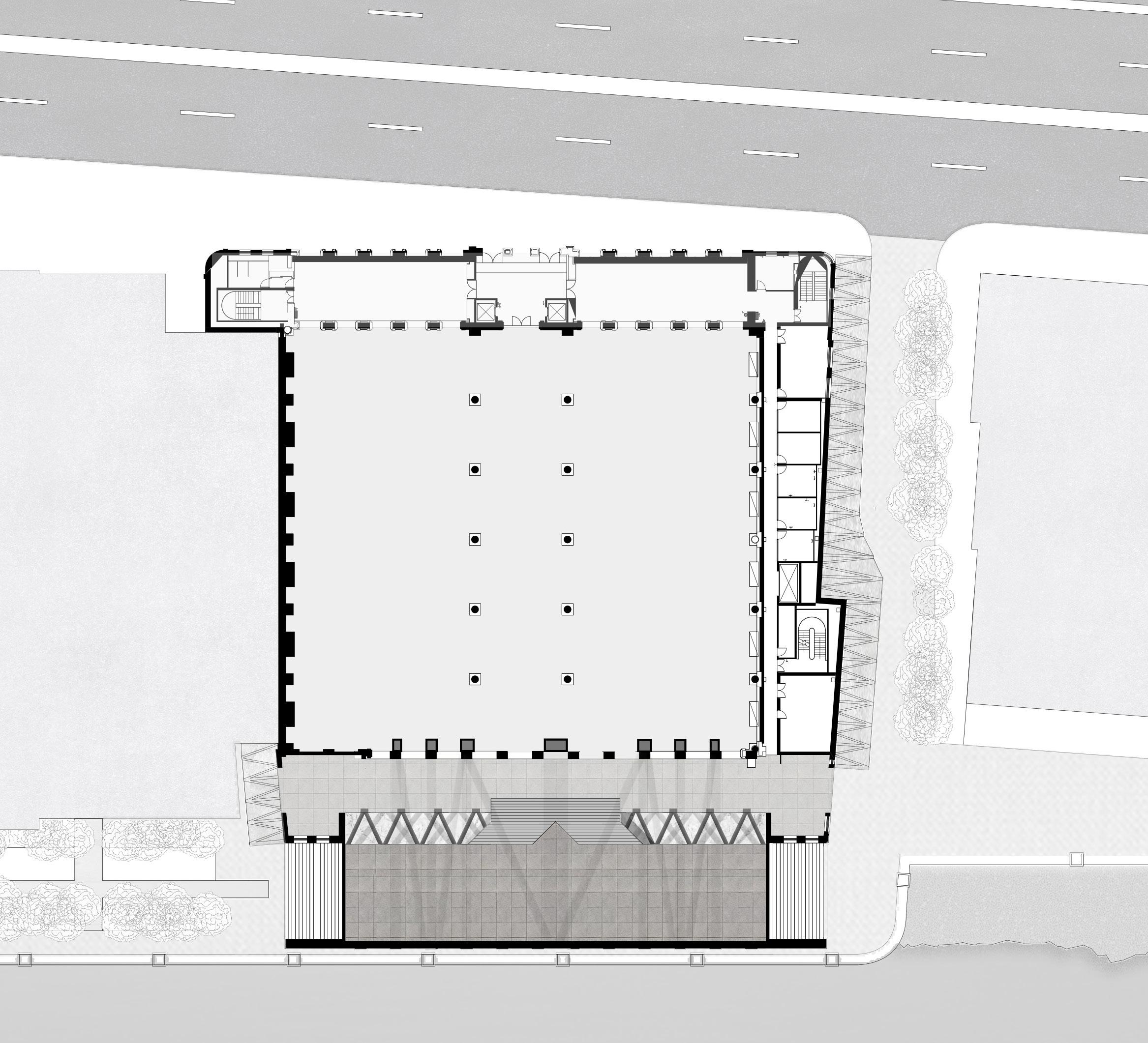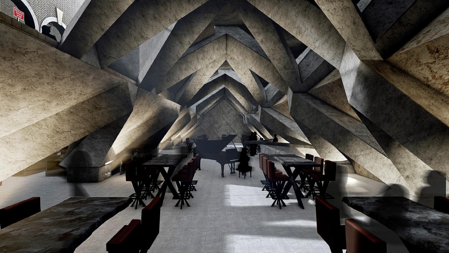 The basement has been imagined as a restaurant/bar that embodies the aesthetic of the vaulted spaces, and an elevated platform serves as a bar and seating area. The project also aims to capture a piece of the plaza and protect it from potential sea level rise.