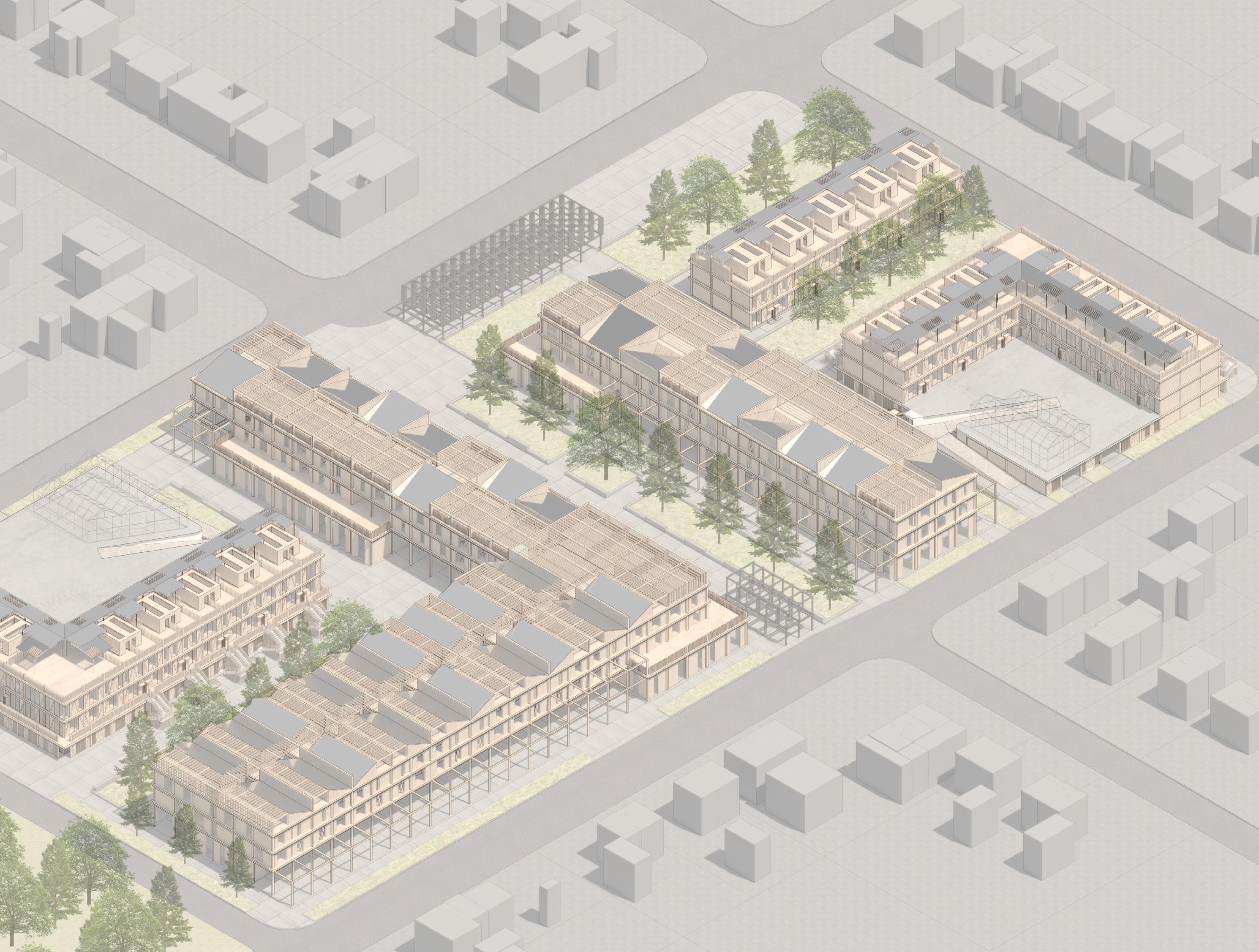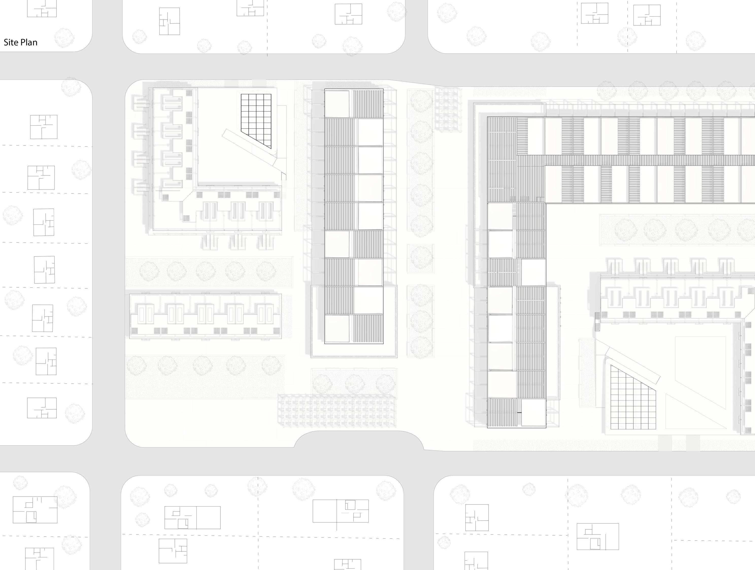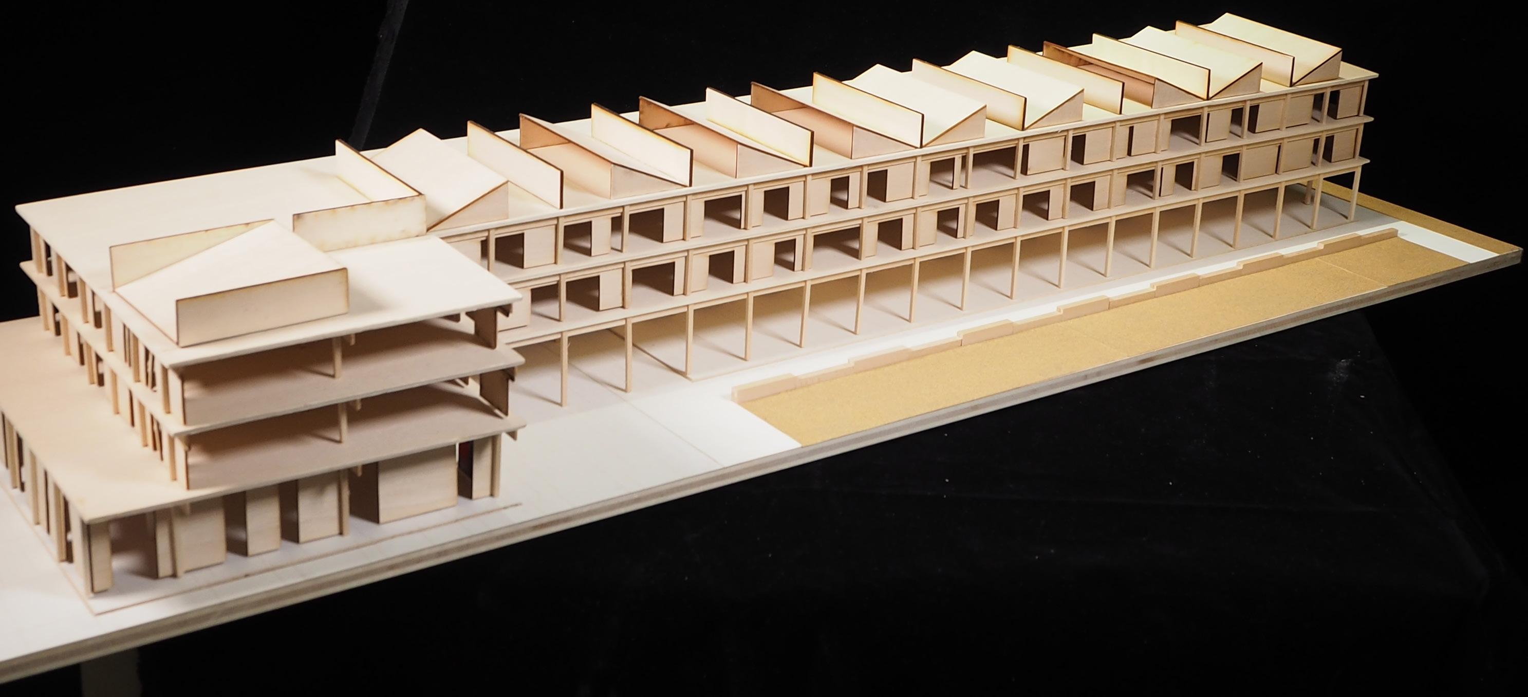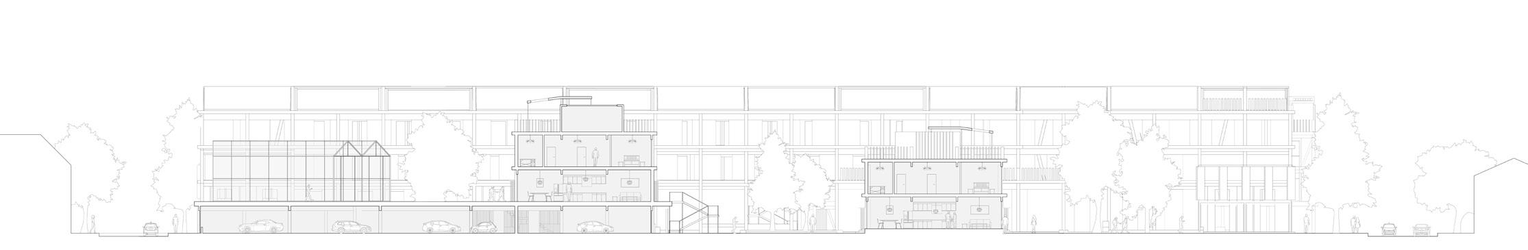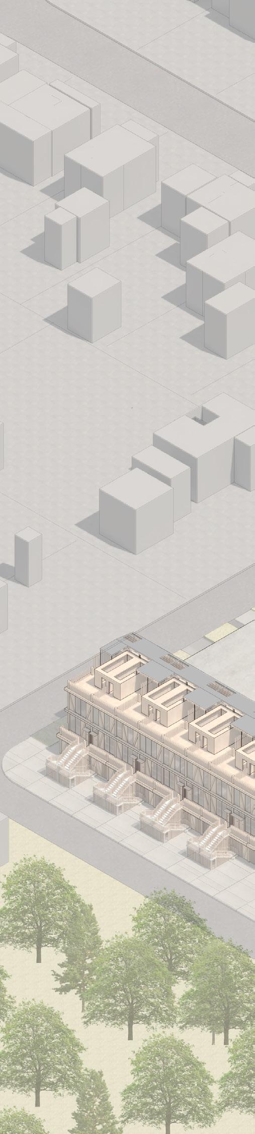 The housing development features 3 building typologies, including 2 apartment buildings with commercial spaces,in an effort to increase affordability. The buildings are designed with shared spaces creating private communal areas. The row houses feature raised masses to accommodate parking and storage, creating elevated public spaces with a private feel. The use of pre-laminated timber and scaffold structures connect the buildings to the neighborhood and enhance community spaces.