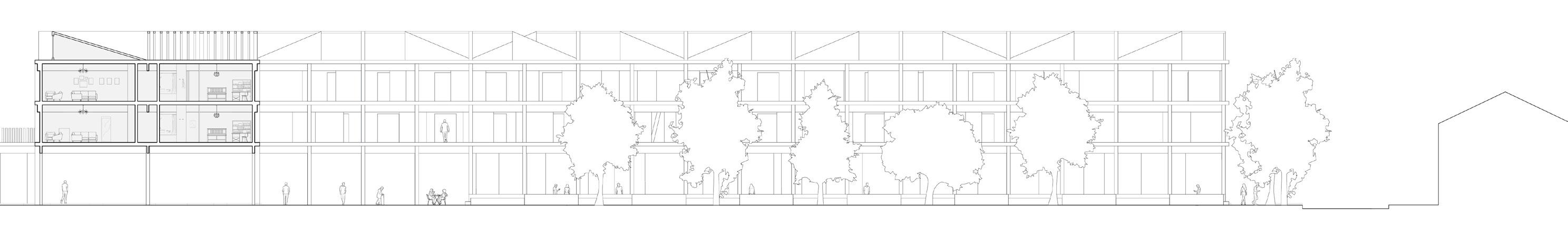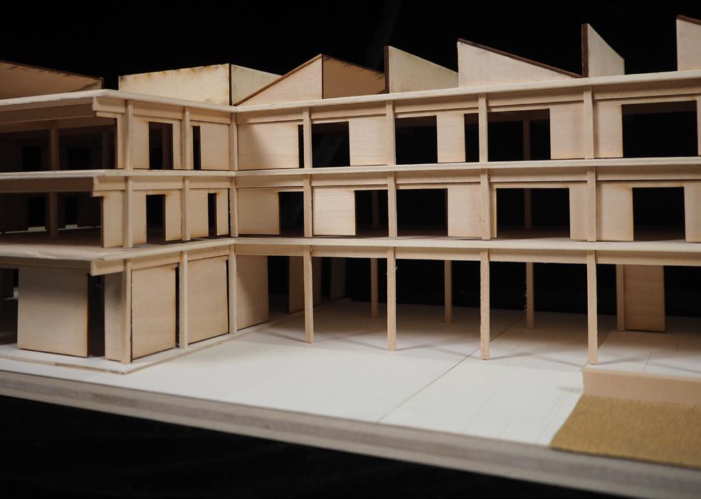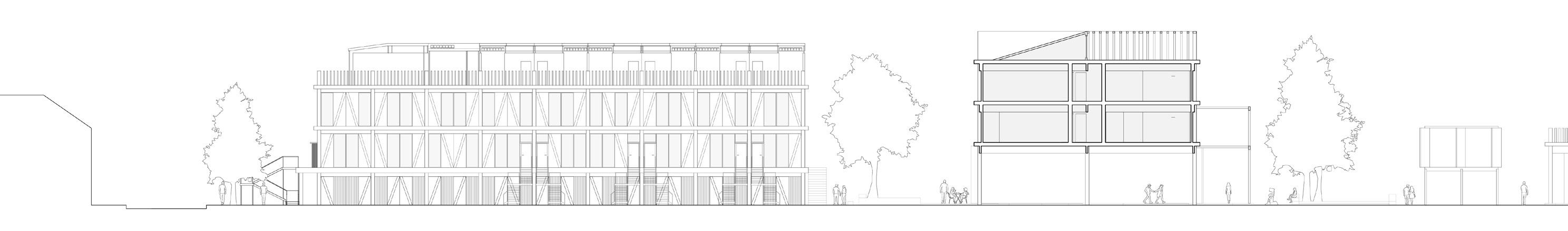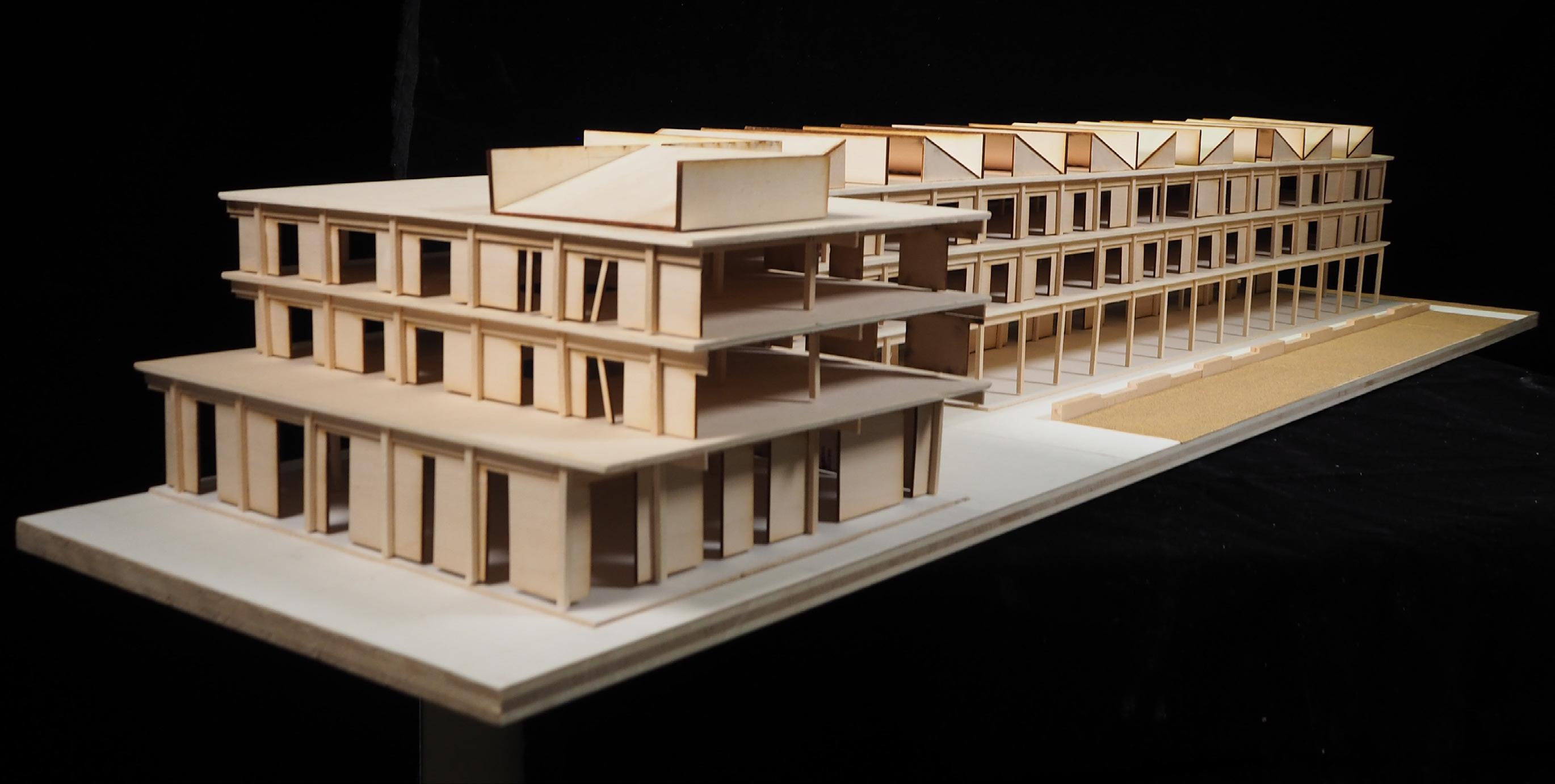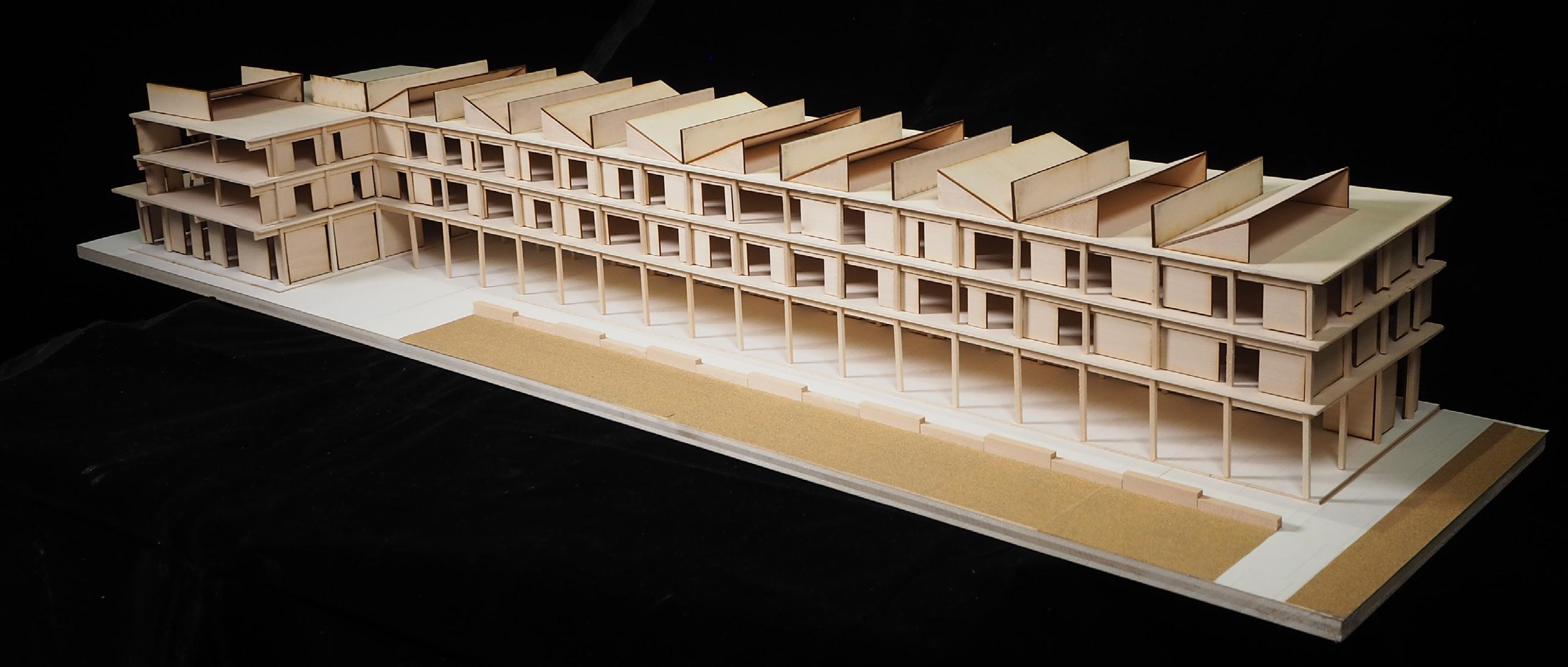 The housing development features 3 building typologies, including 2 apartment buildings with commercial spaces,in an effort to increase affordability. The buildings are designed with shared spaces creating private communal areas. The row houses feature raised masses to accommodate parking and storage, creating elevated public spaces with a private feel. The use of pre-laminated timber and scaffold structures connect the buildings to the neighborhood and enhance community spaces.