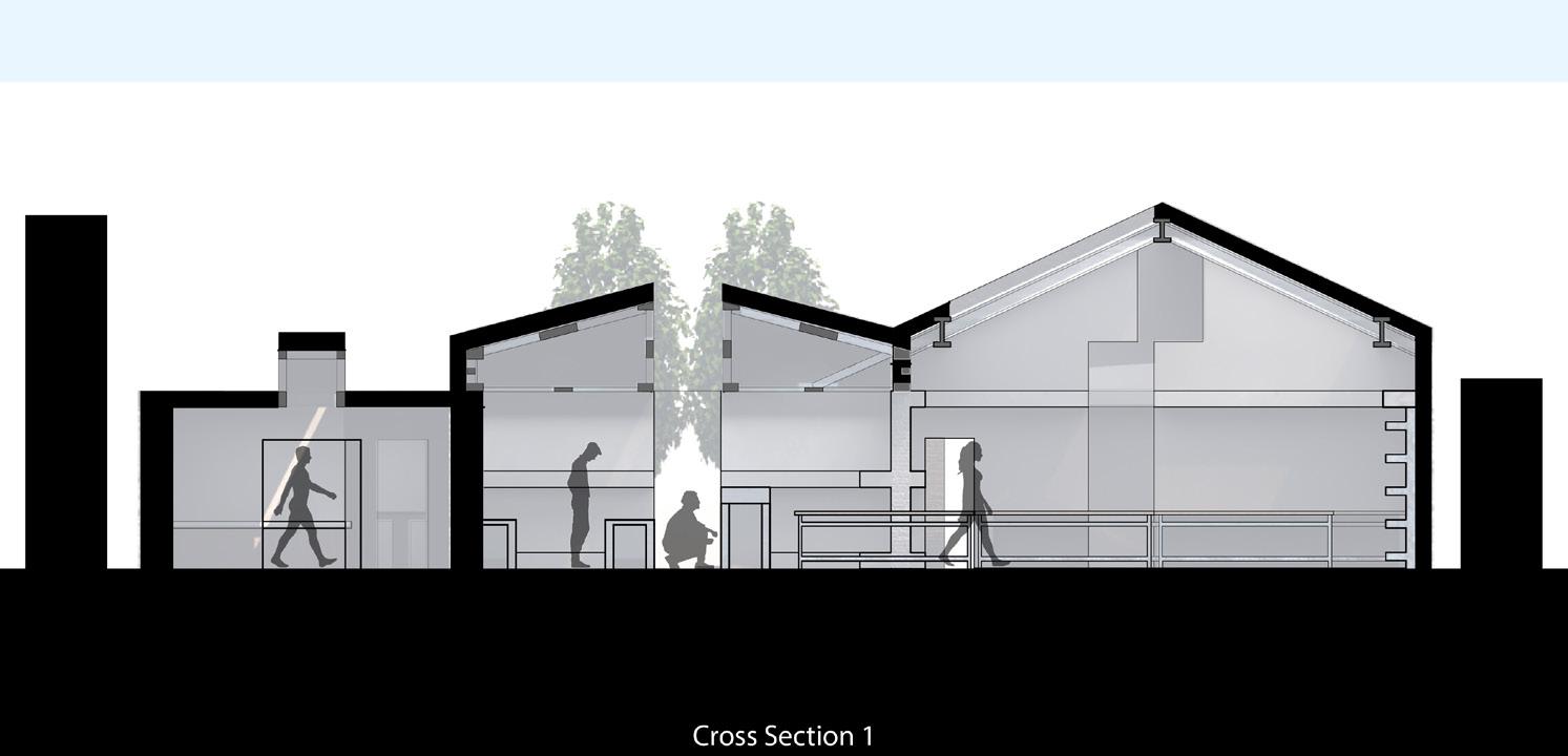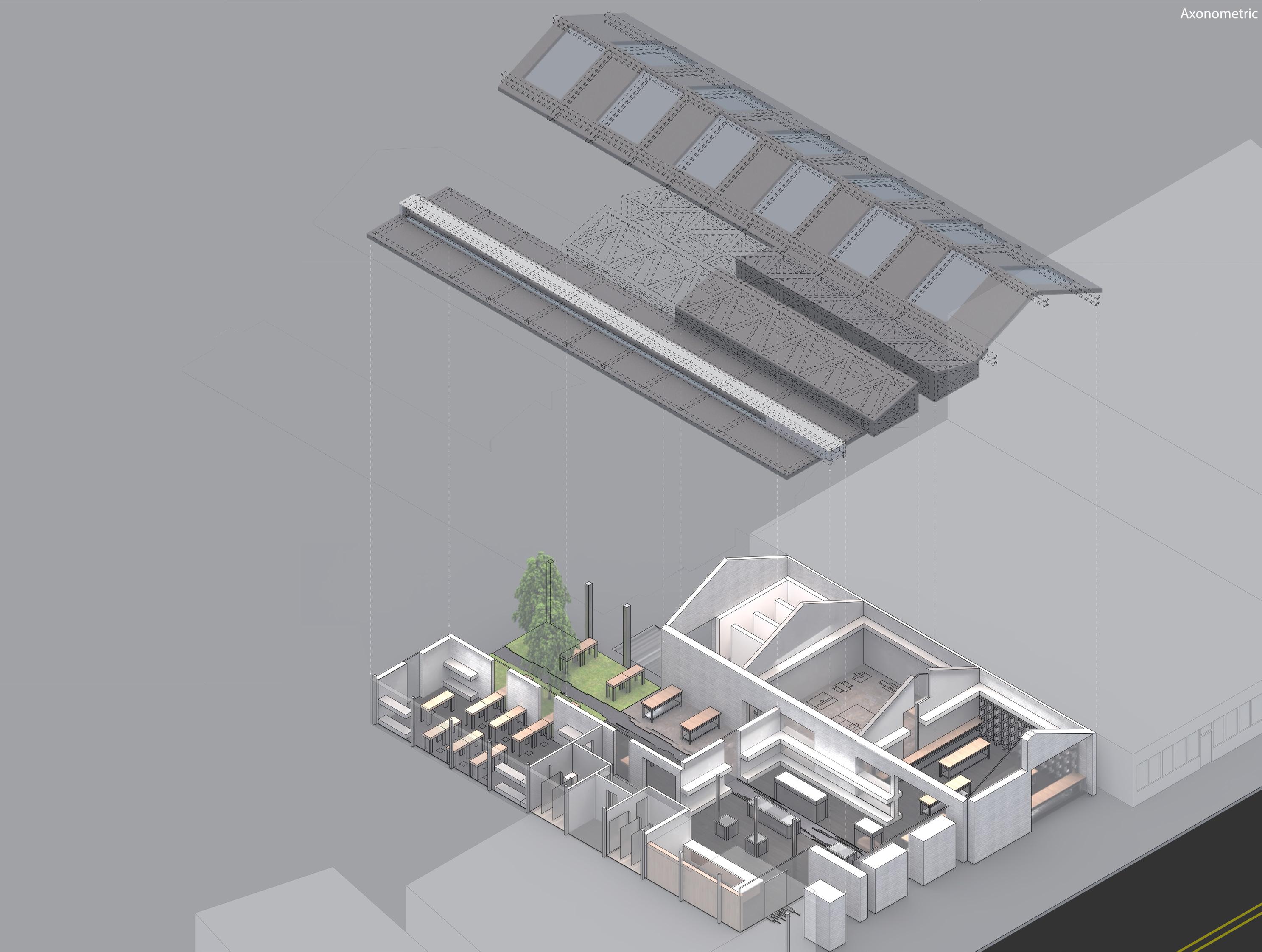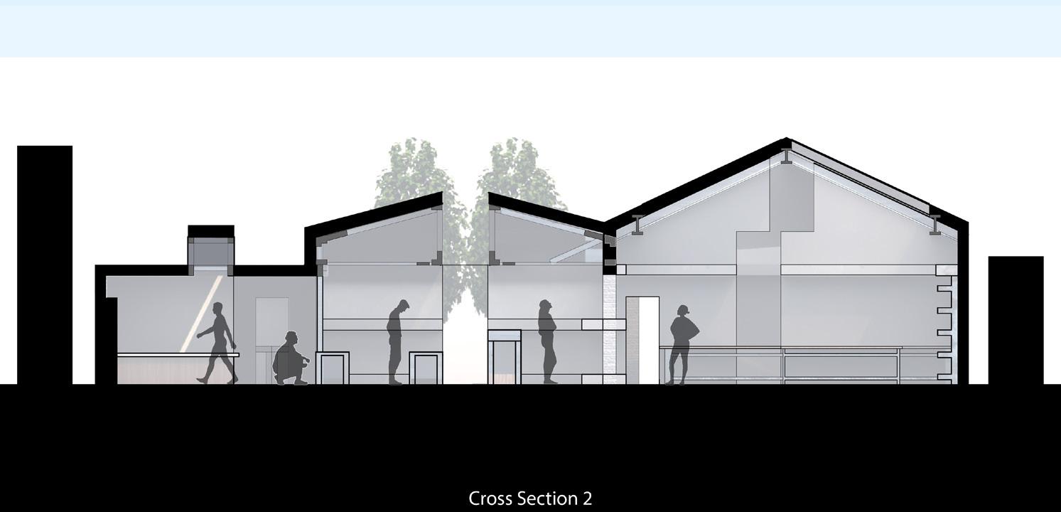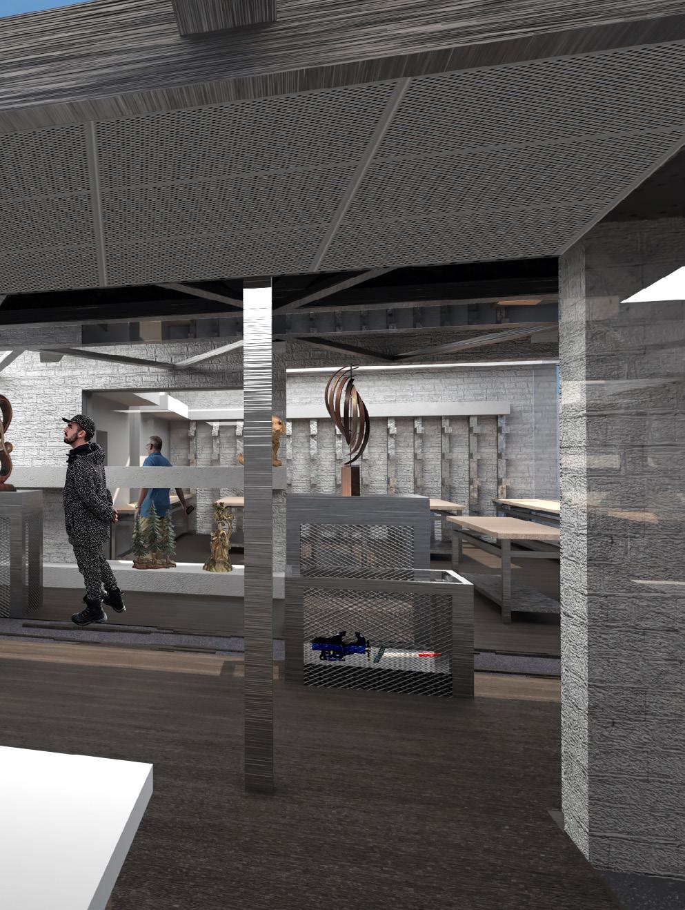 There is an outdoor gathering space located in the middle bay that works as a rest/eating area, and combines the programmatic responsibilities of all 3 bays, allowing for small events and presentations to take place.