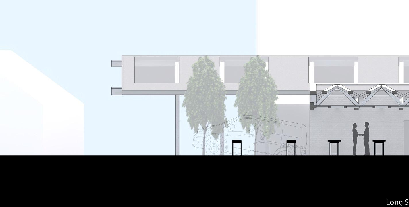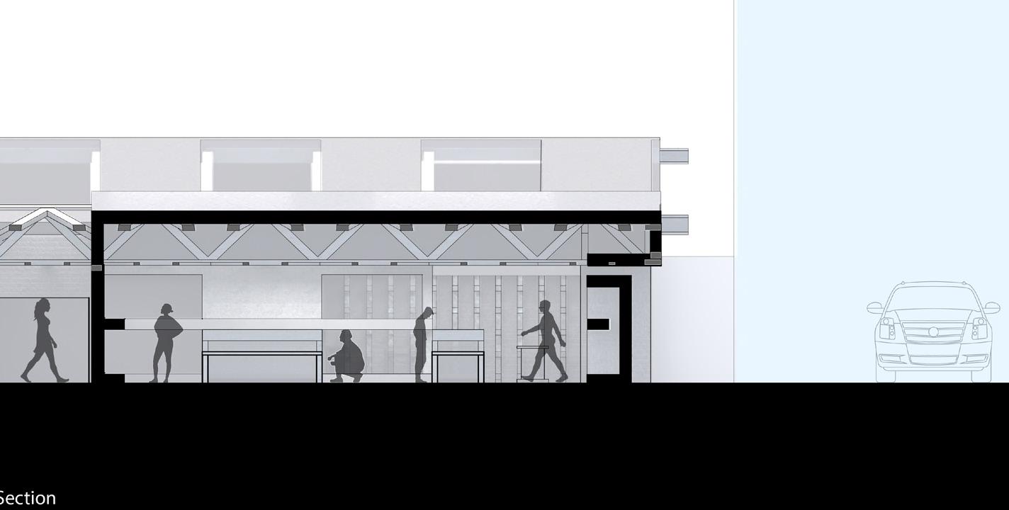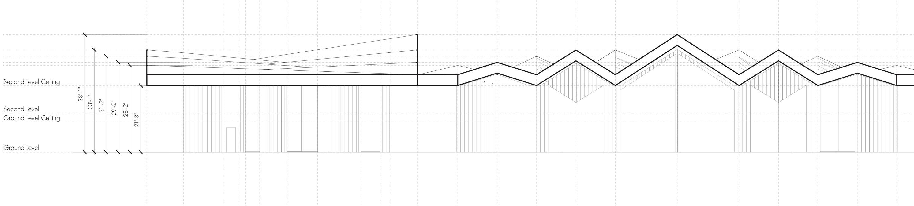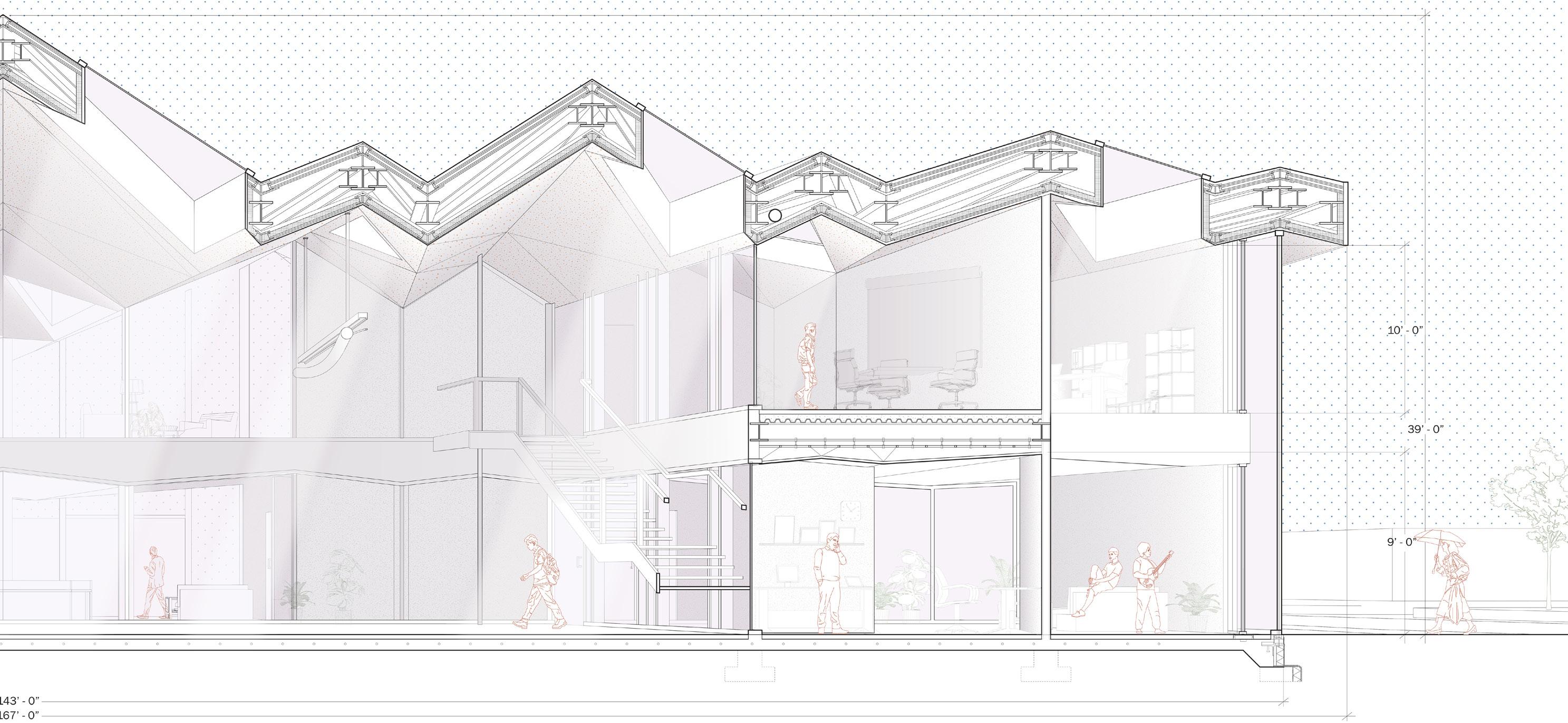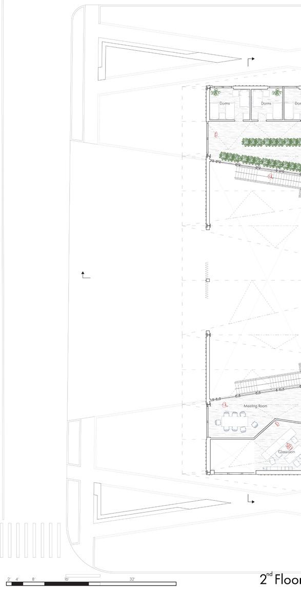 There is an outdoor gathering space located in the middle bay that works as a rest/eating area, and combines the programmatic responsibilities of all 3 bays, allowing for small events and presentations to take place.