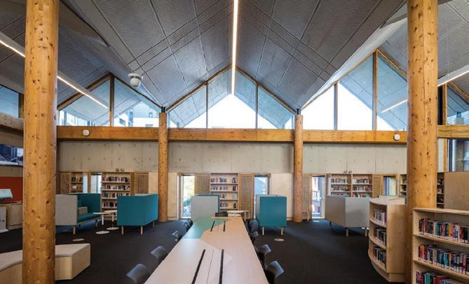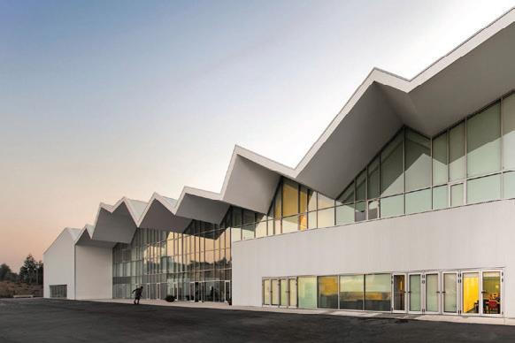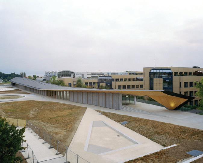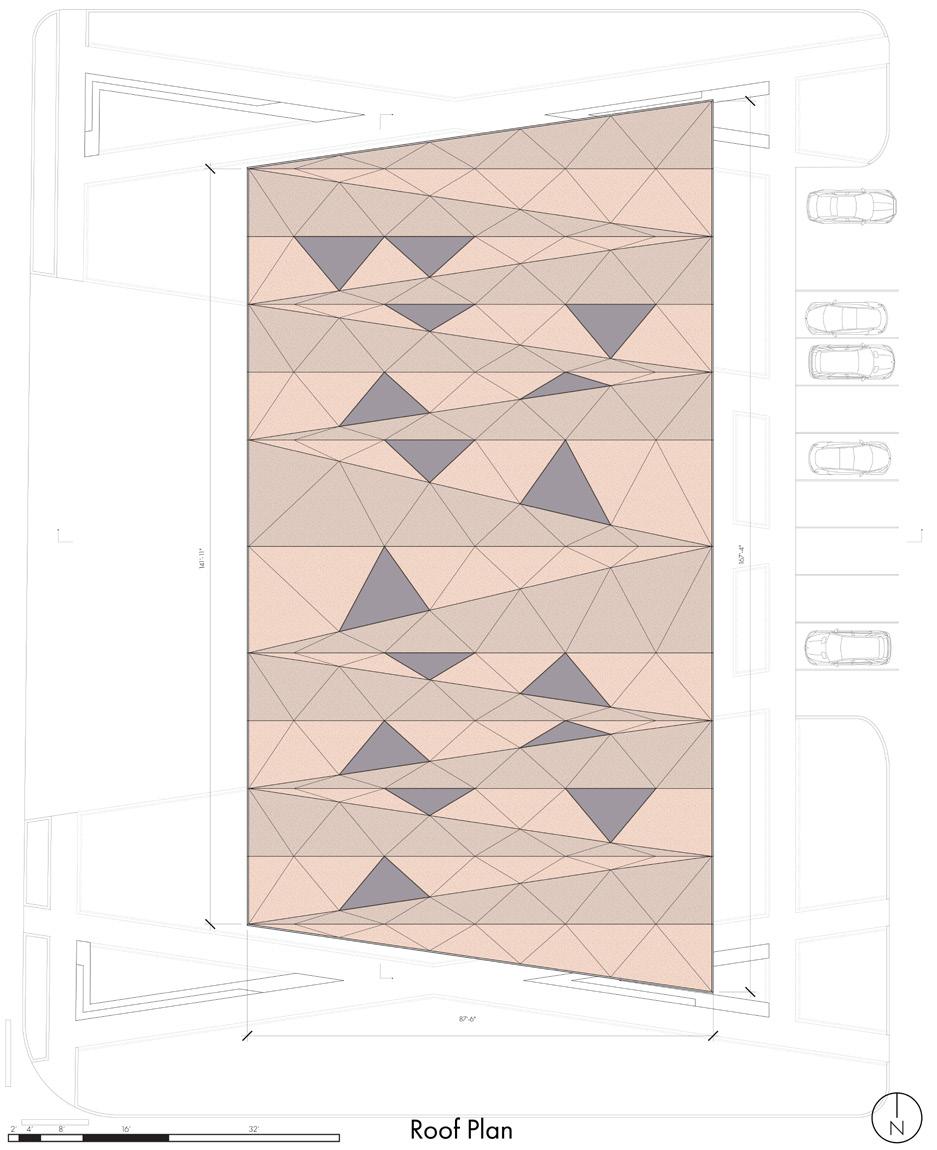 The design of the fire station is characterized by a roof with pitches of dramatic pitches are located above the apparatus bay, emphasizing apparatus bay are influenced by the roof geometry, creating an engaging tions, such as street traffic, guided the placement of programs, with private way street. Convenient parking off the alleyway is provided for firefighters