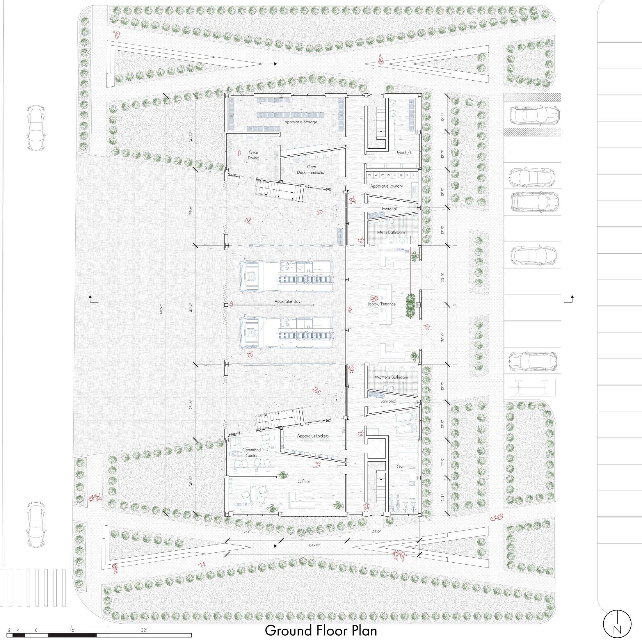 The fire station is a unique building typologu which combines a diverse set of diagrams. It requires a unique composition and relationship, and because it requires a transition between mechanical and residential spaces.