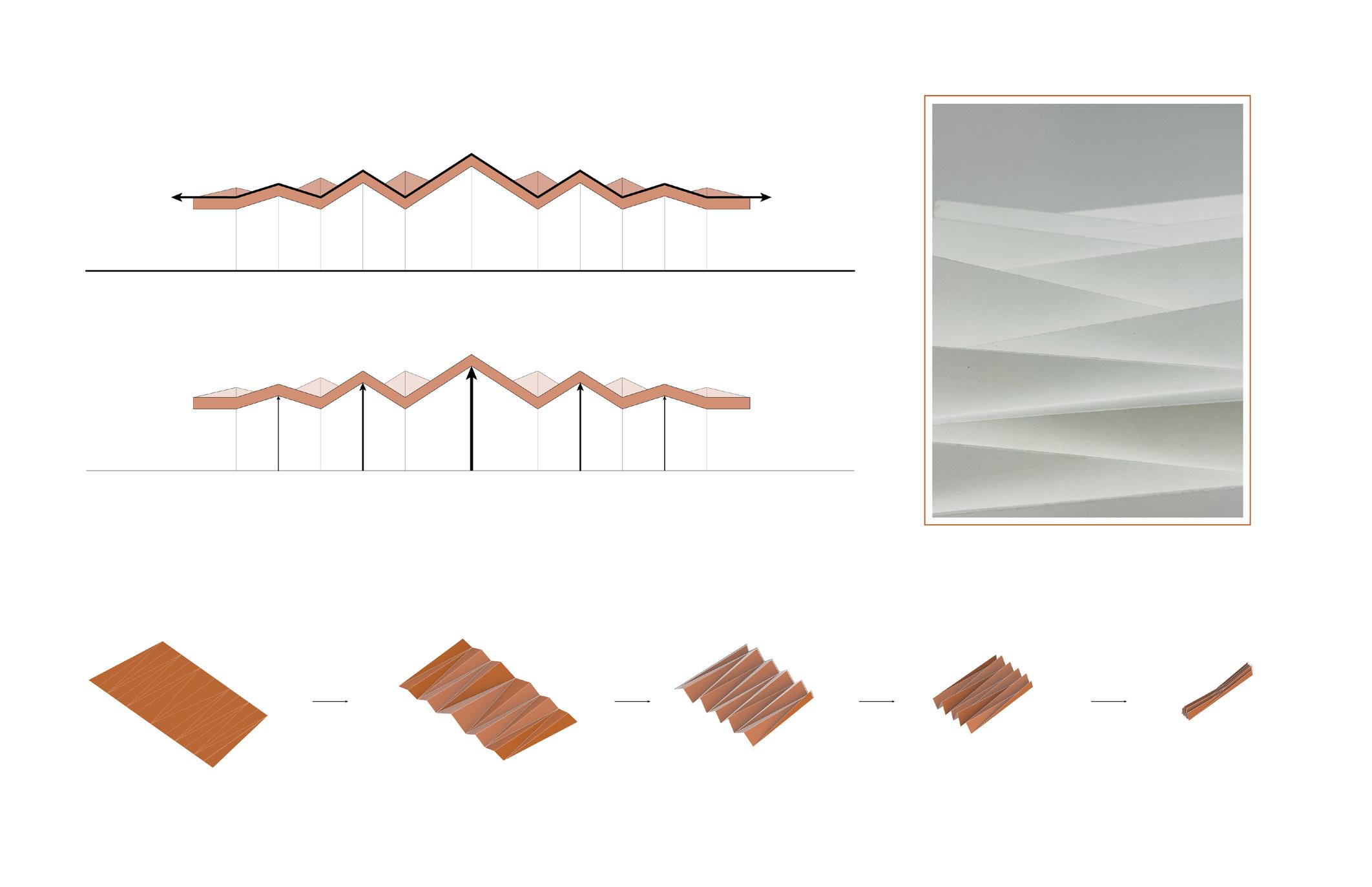 The pleated roof can deliniate space as a cantilever and appear dramatic