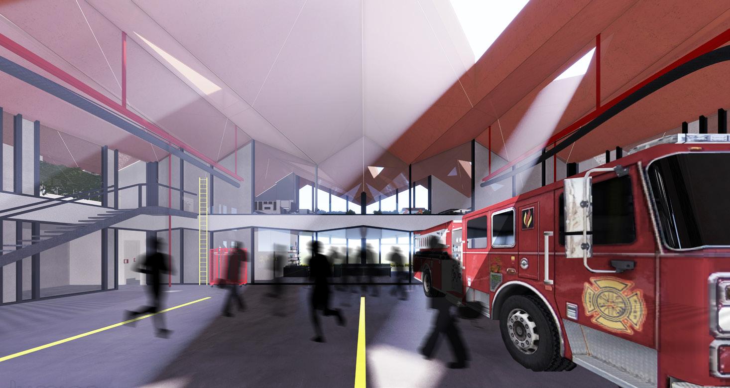 The design concept can be likened to a fire blanket, symbolizing the covering and unification of the various programs that are typically separate within a fire station. The fire blanket design metaphor celebrates the apparatus bay as the central element, while promoting functional and visual harmony among all the diverse spaces present in the fire station.