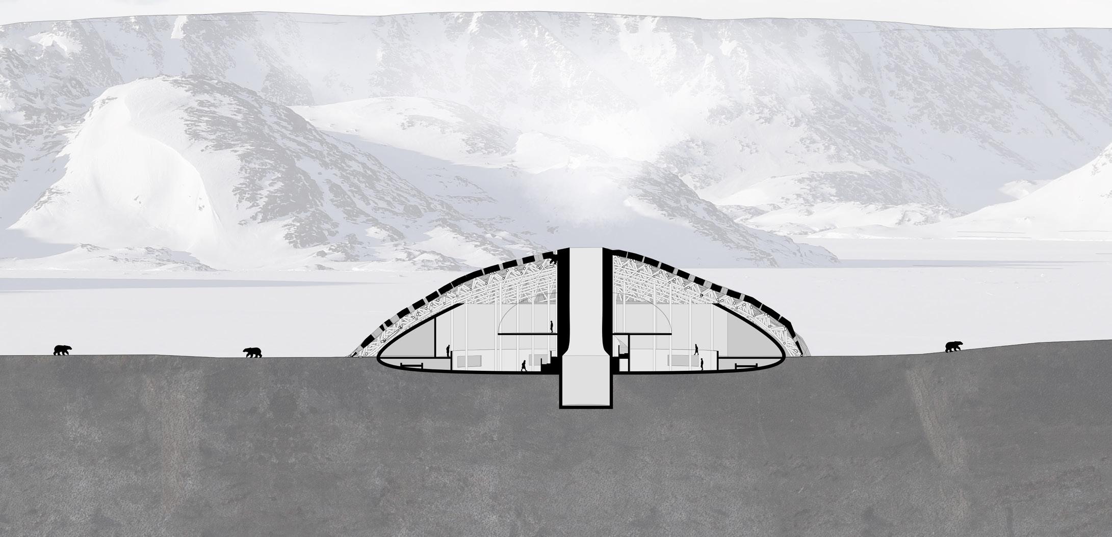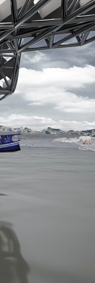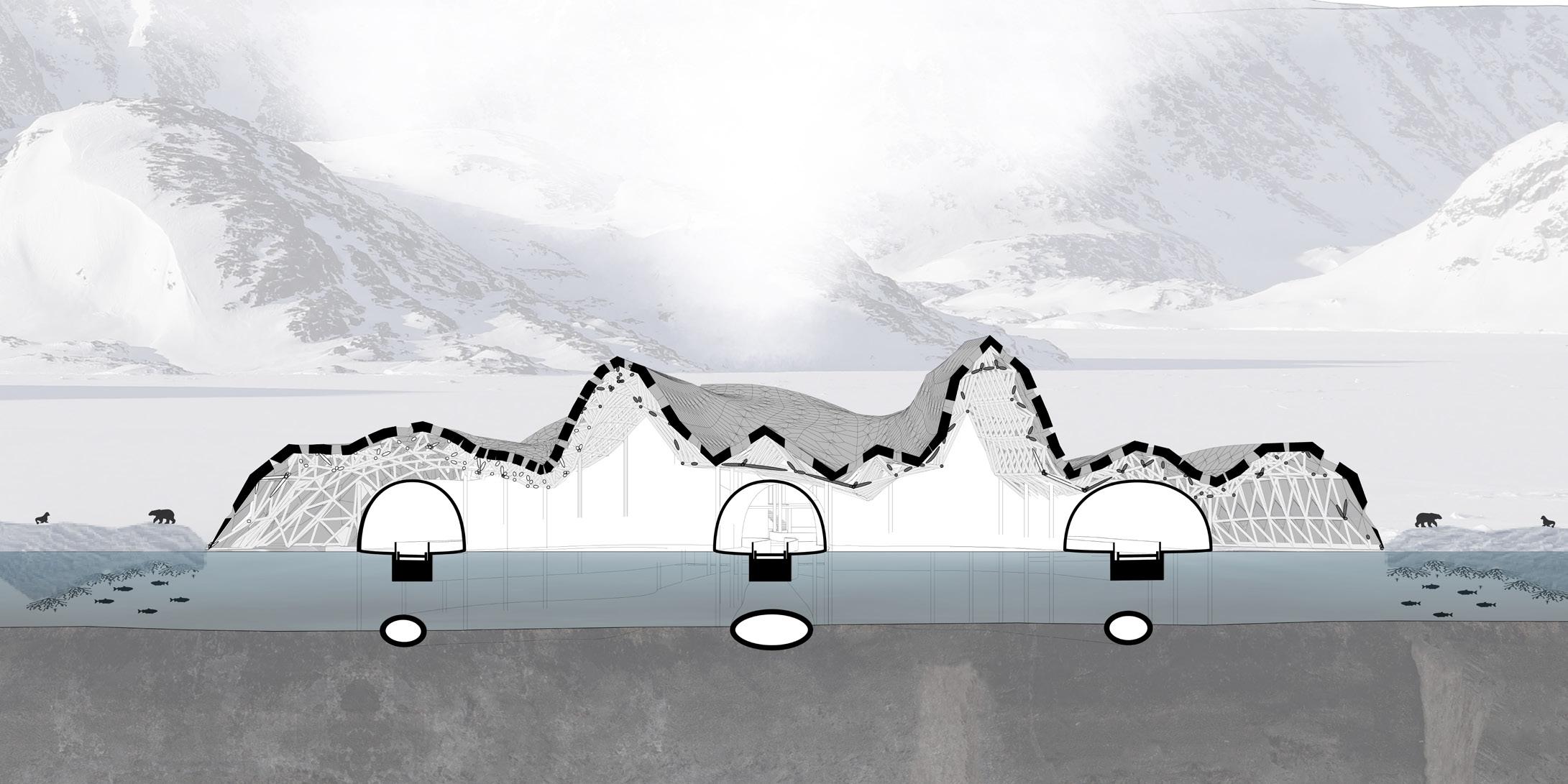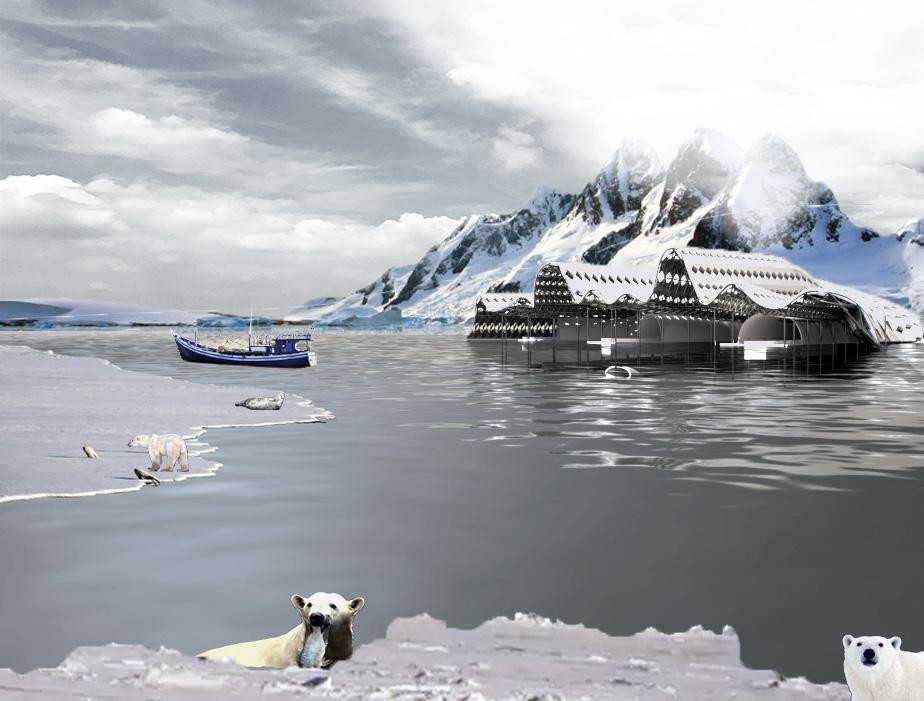 Theoretical “vessels” were designed which adressed our ecological threats. Our vessel sprays desalinated seawater onto surrounding ice as it passes. It also implements the use of regular saltwater and sprays it into the atmosphere to increase and brighten cloud cover, which is part of a process called “cloud-whitening”. This allows for more sun rays to be reflected back into the atmosphere. Our archive acts in a similar manner to the vessel, keeping the cloud-whitening aspect. The vessel also interacts with the archive, docking at any one of three fingers, dropping off the brine that it collects up as a result of the desalination process.