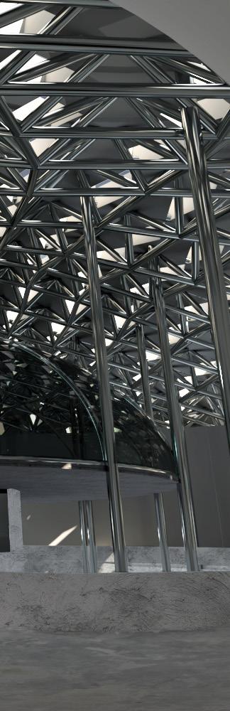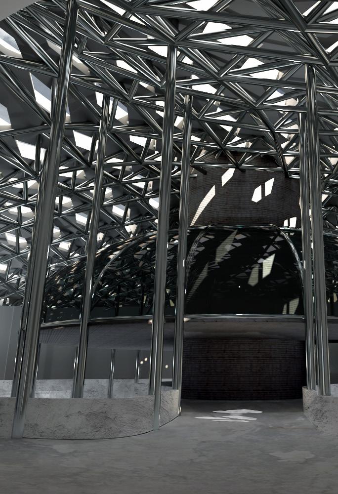 The exterior skin of the archive is made of a reflective material, allowing for sun rays to be reflected off the building mass. This skin is then supported by a space frame structure and an accompanying system of columns.
