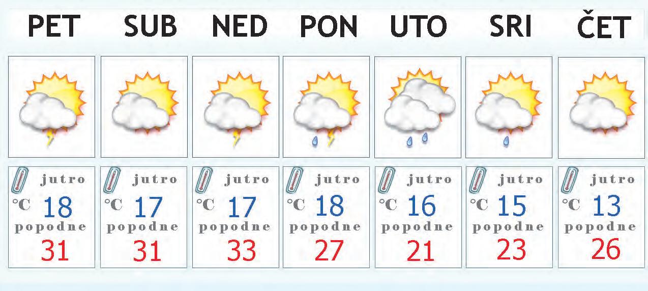 biti malo normalnija, oko 30 Celzijevih stupnjeva. Čini se da takvu situaciju možemo u subotu očekivati i u Zagrebu. Ako dan provodite na otvorenom imajte na umu da je UV indeks vrlo visok, osobito između 10 i 17 sati i da treba piti dovoljno tekućine. U nedjelju pretežno sunčano i ponovno nekoliko stupnjeva toplije. Obilje sunca i lagana južina mogli bi natjerati dnevni maksimalac opet blizu 35 stupnjeva. Postoji šansa za kraći popodnevni pljusak u okolici, ali to još nije neka raširena kiša.
