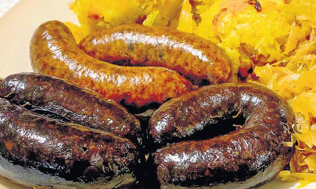 Dinstano kiselo zelje: Crveni luk narezati na sitno. U posudu na dno staviti malo ulja, ispeci luk dok omekša. Dodati kiselo zelje i uz miješanje kuhati 15-tak minuta dok ne omekša. Restani krumpir: Krumpir skuhati u kori, oguliti i kuhani naribati. Crveni luk narezati na sitno. U posudu na dno staviti malo ulja, ispeci luk dok omekša. Ubaciti naribani krumpir, dobro promiješati, te posoliti prema ukusu. Pečene krvavice: Posudu za pečenje namazati svinjskom masti. Staviti krvavice. Peći u zagrijanoj pećnici na 180 stupnjeva cca. 30 minuta.