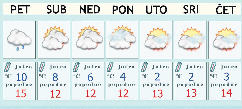 sredinu dana i poslijepodne. Dnevna temperatura malo niža nego prethodnih dana, ali to će biti potpuno normalno za ovaj datum. Ujutro oko desetke, prije kiše oko 15 °C, a krajem dana hladnije. Navečer će i vjetar zapuhati iz smjera sjeveroistoka.